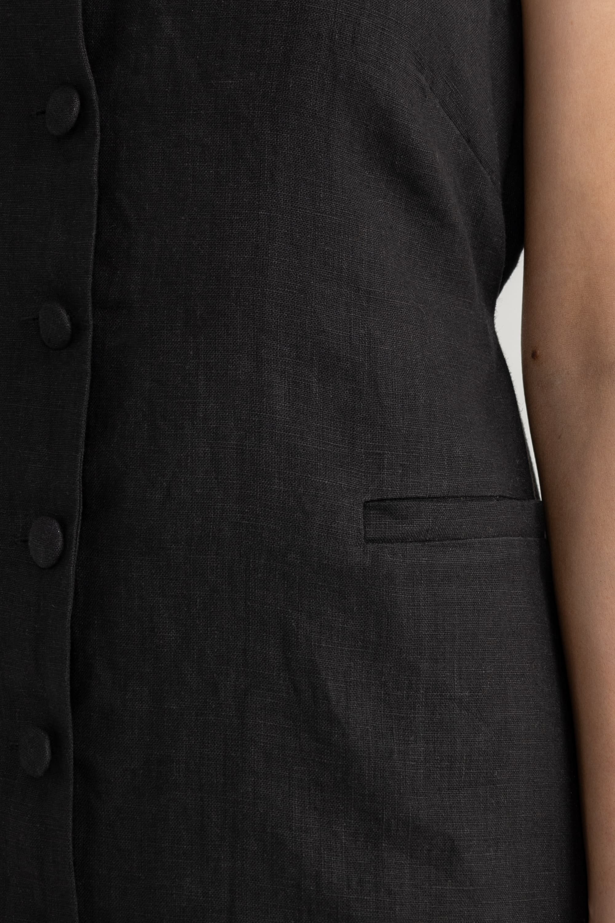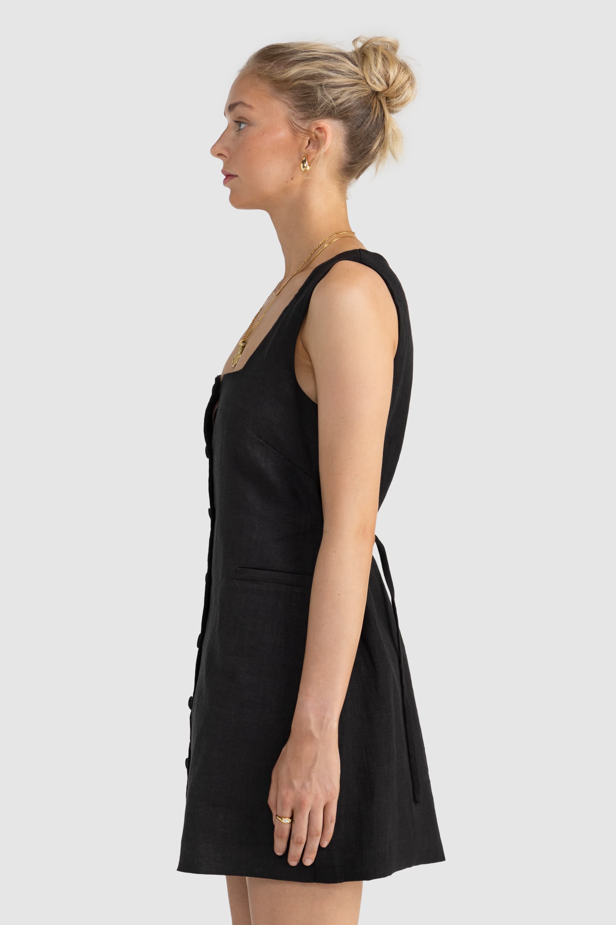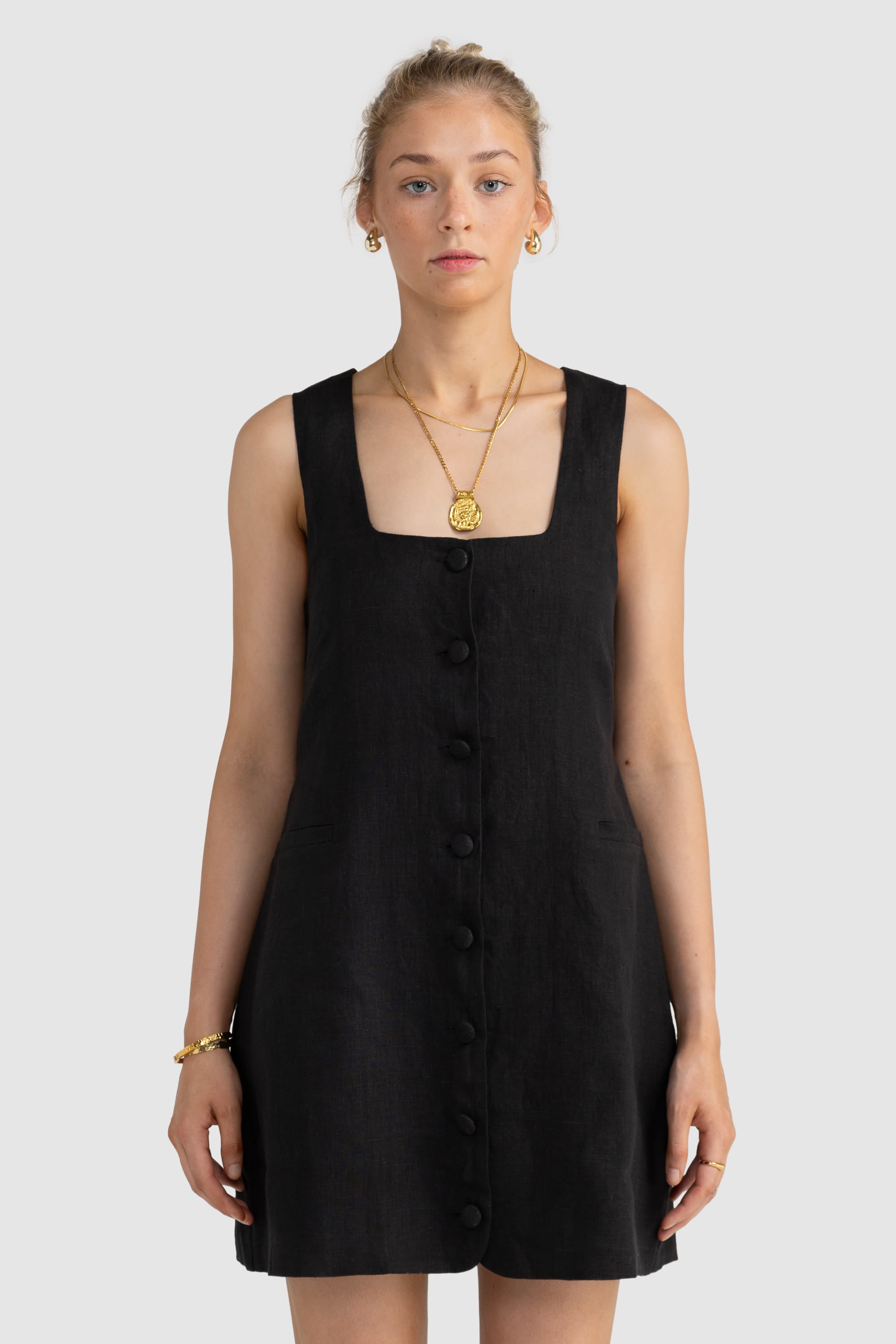 Summer is calling with our Cora Linen Button Mini Dress Black. This effortless mini dress will be your go to for dinner parties or nights out.