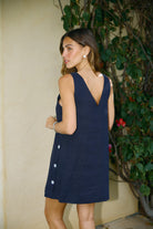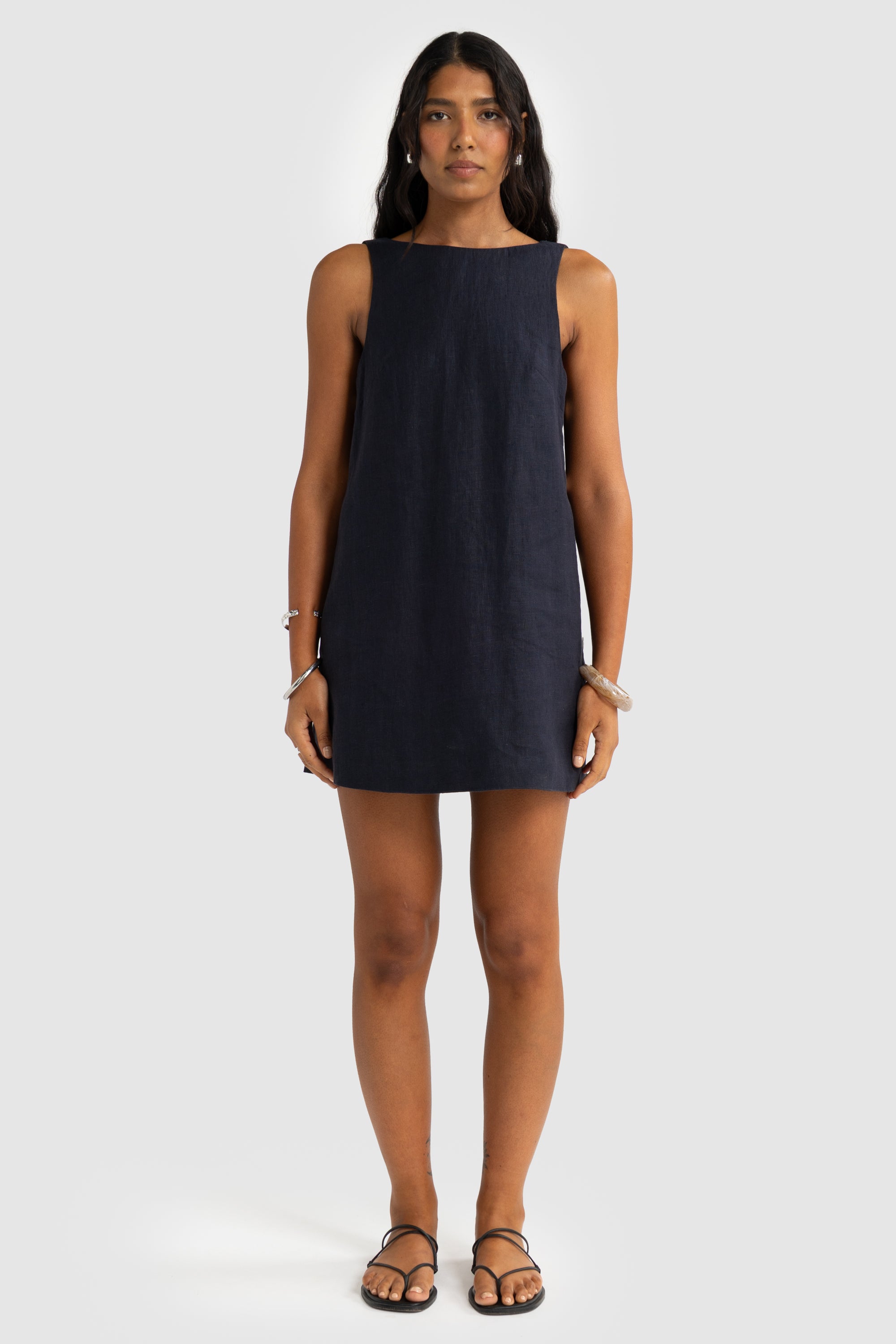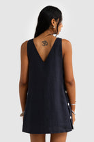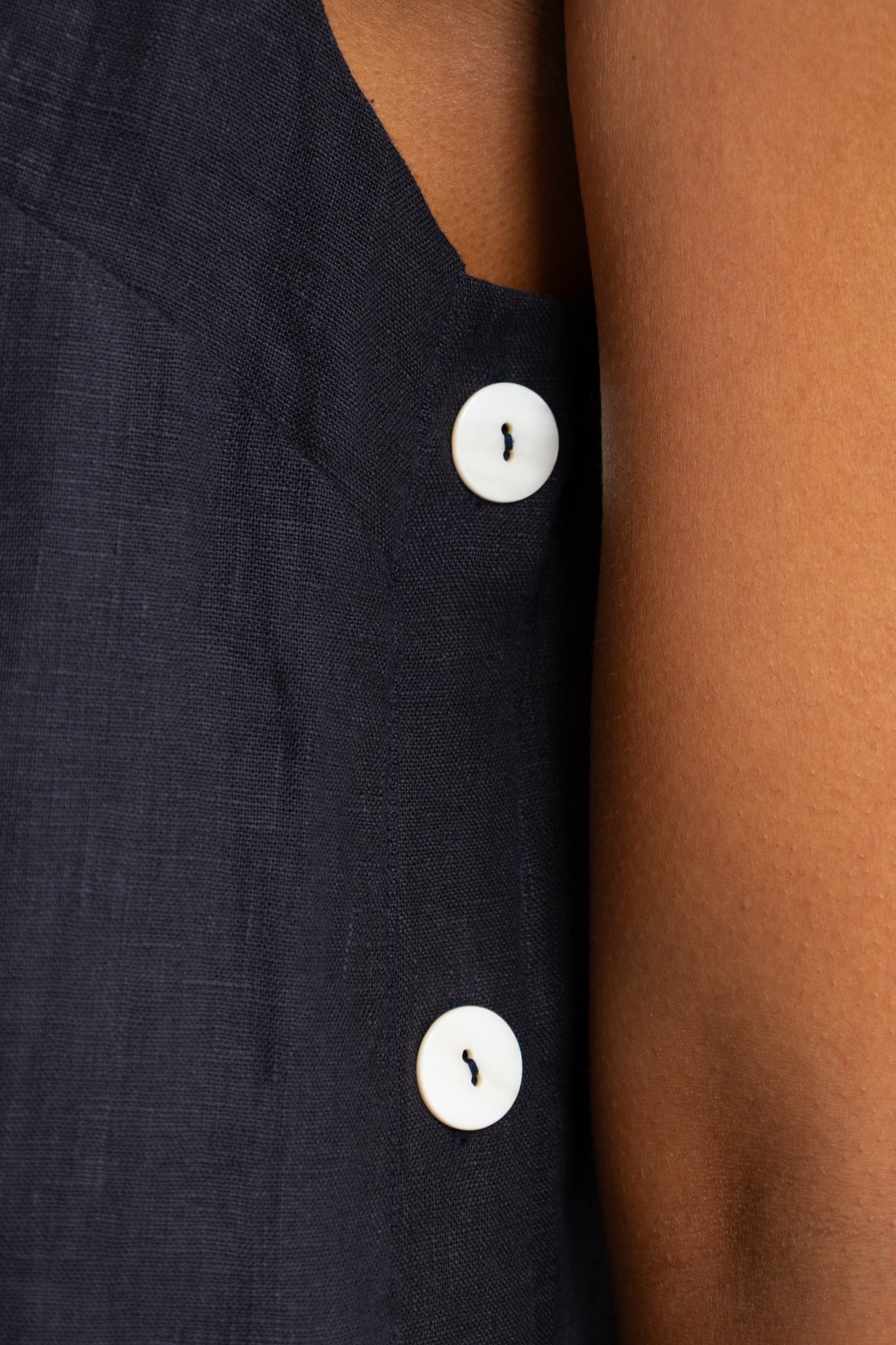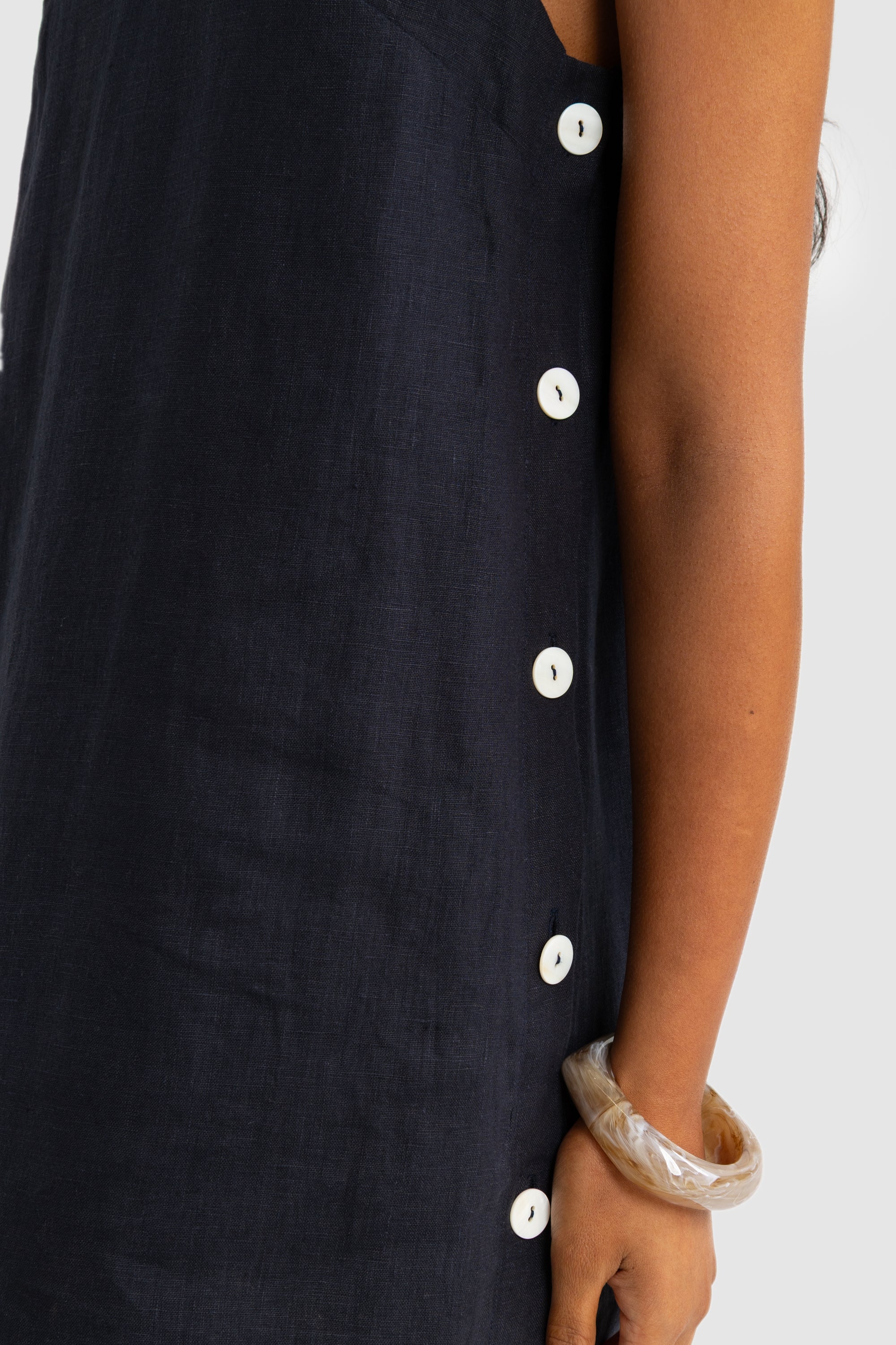 Effortlessly refined, the Jolie Button Side Mini is crafted from 100% linen for a natural, breathable feel. This sleeveless mini features a high neckline, subtle A-line silhouette, and deep V back for a touch of ease and femininity. The button-through side adds a modern detail, balancing simplicity with edge. Pair it with slides for effortless daywear or elevate with heels for an understated evening look.