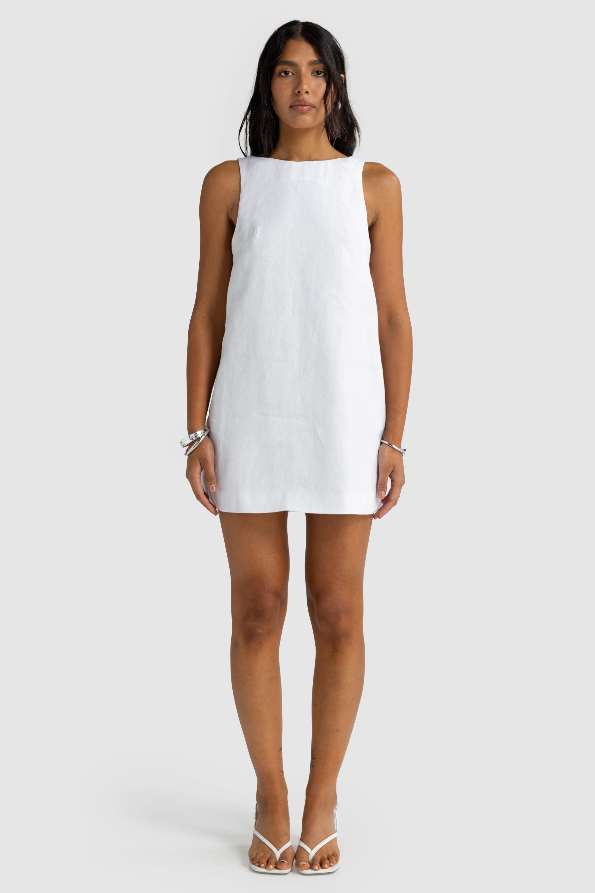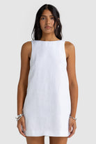 Effortlessly refined, the Jolie Button Side Mini is crafted from 100% linen for a natural, breathable feel. This sleeveless mini features a high neckline, subtle A-line silhouette, and deep V back for a touch of ease and femininity. The button-through side adds a modern detail, balancing simplicity with edge. Pair it with slides for effortless daywear or elevate with heels for an understated evening look.