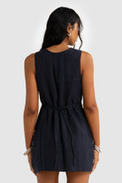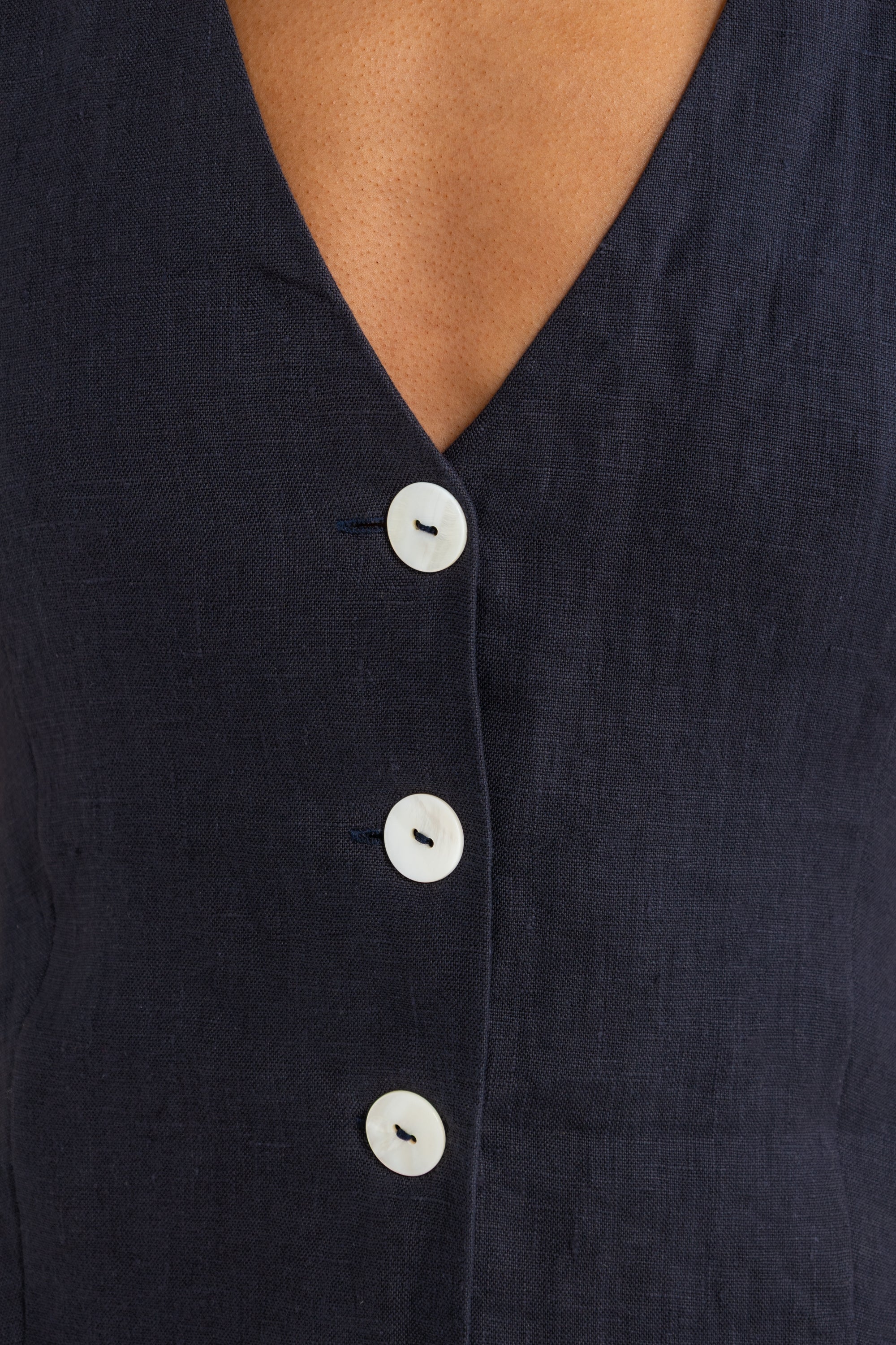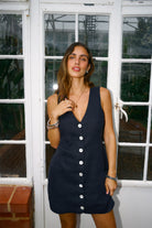 Timeless and effortlessly cool, the Koda Linen Mini is your go-to for warm-weather dressing. Made from 100% linen and fully lined, it features a flattering V-neckline, contrast buttons, and a clean, structured silhouette. A fabric tie at the back lets you cinch the waist for a more tailored fit. Style with heels or sandals for a versatile look.