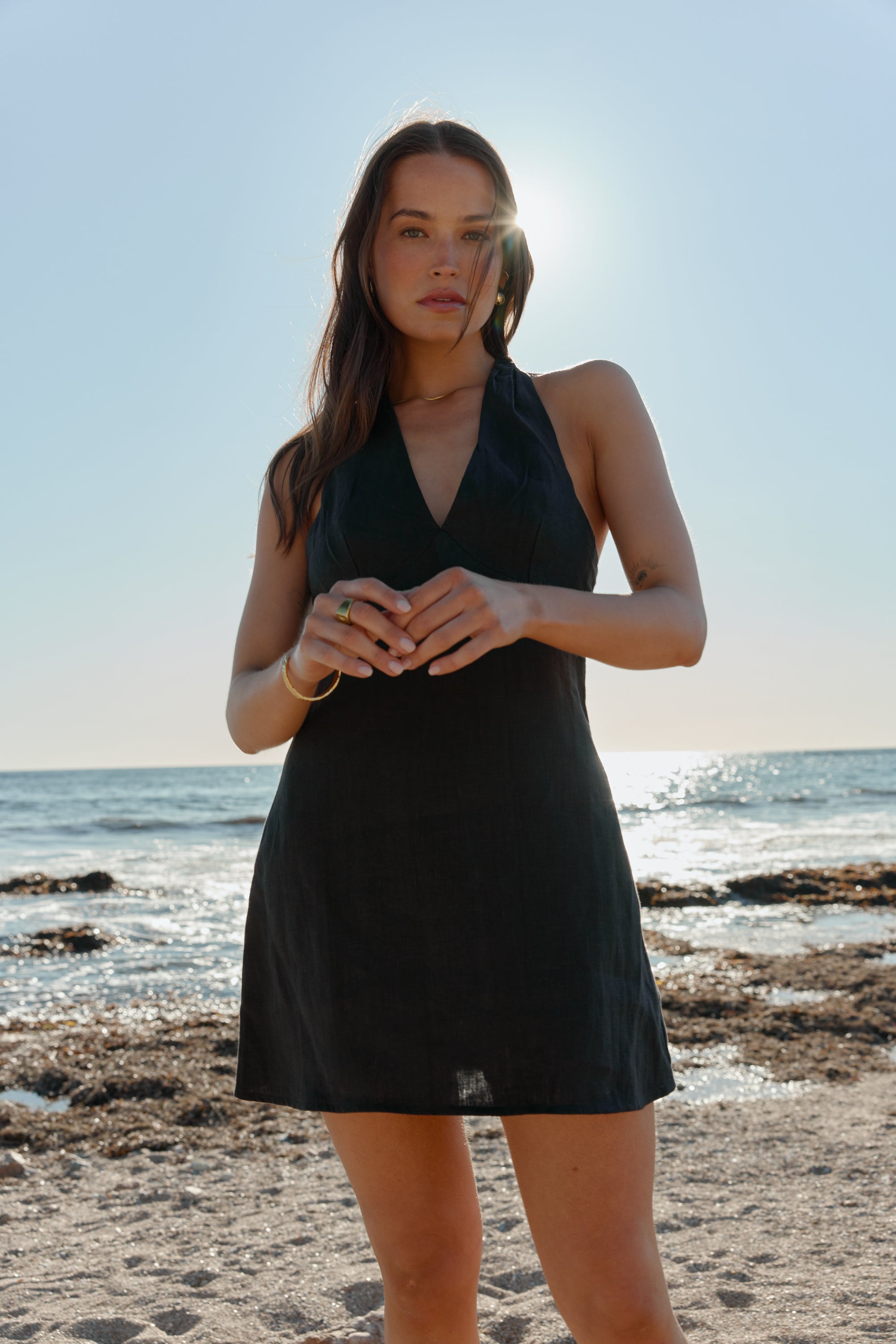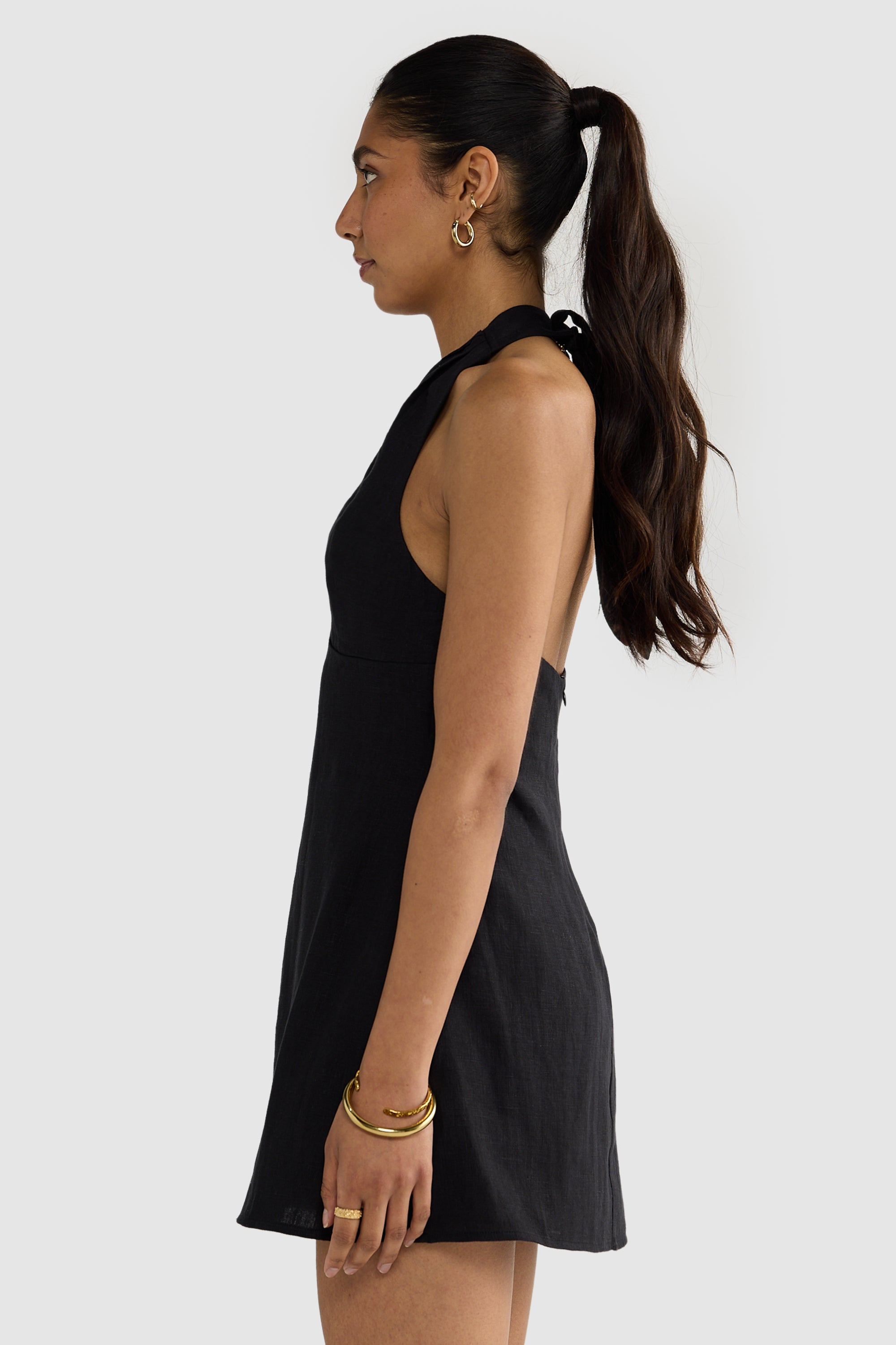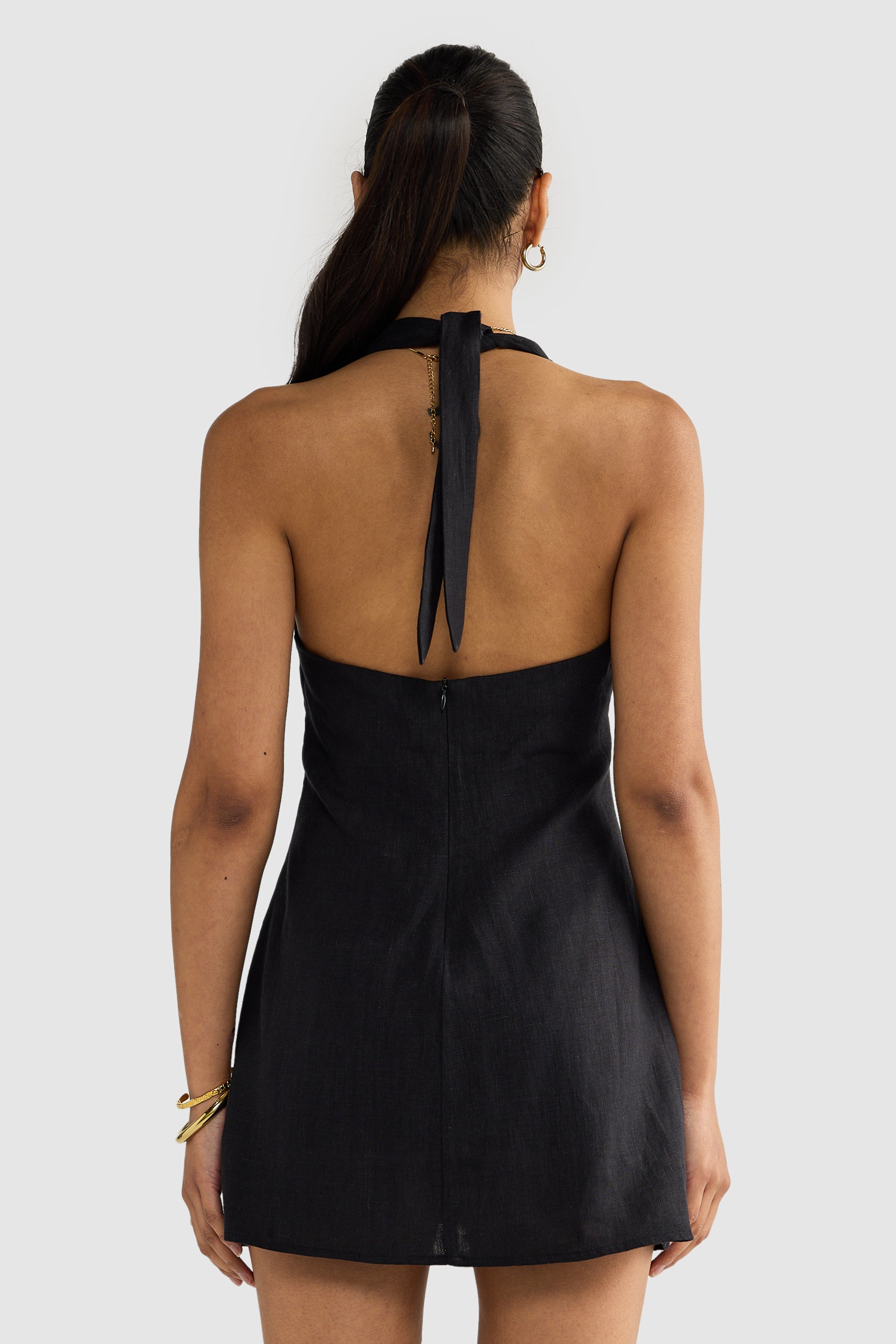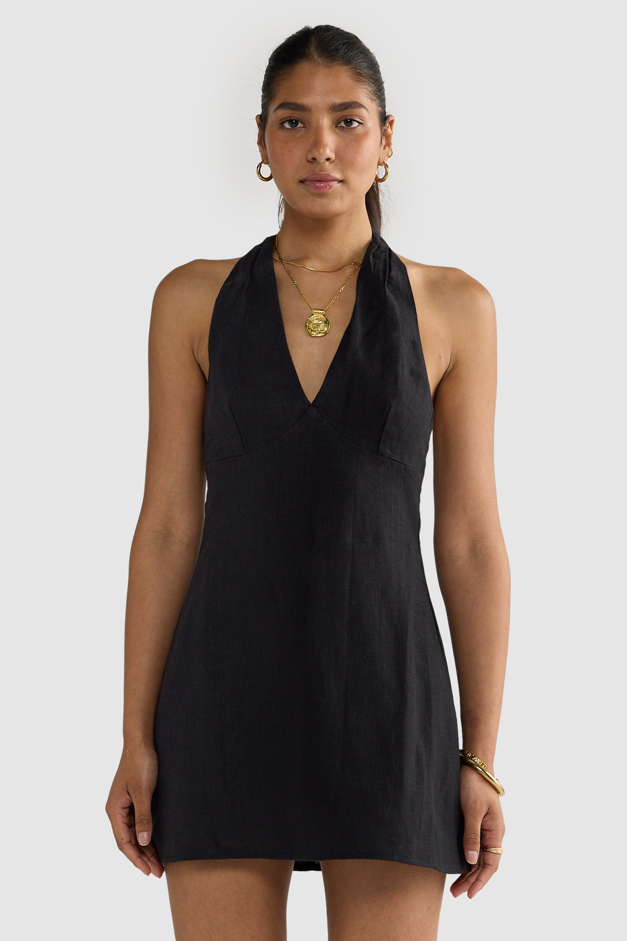 Introducing the Rosa Linen Mini Dress Black, designed for day to night styling. With a flattering a-line silhouette and halter neck, this dress is guaranteed to be on high rotation in your summer wardrobe.