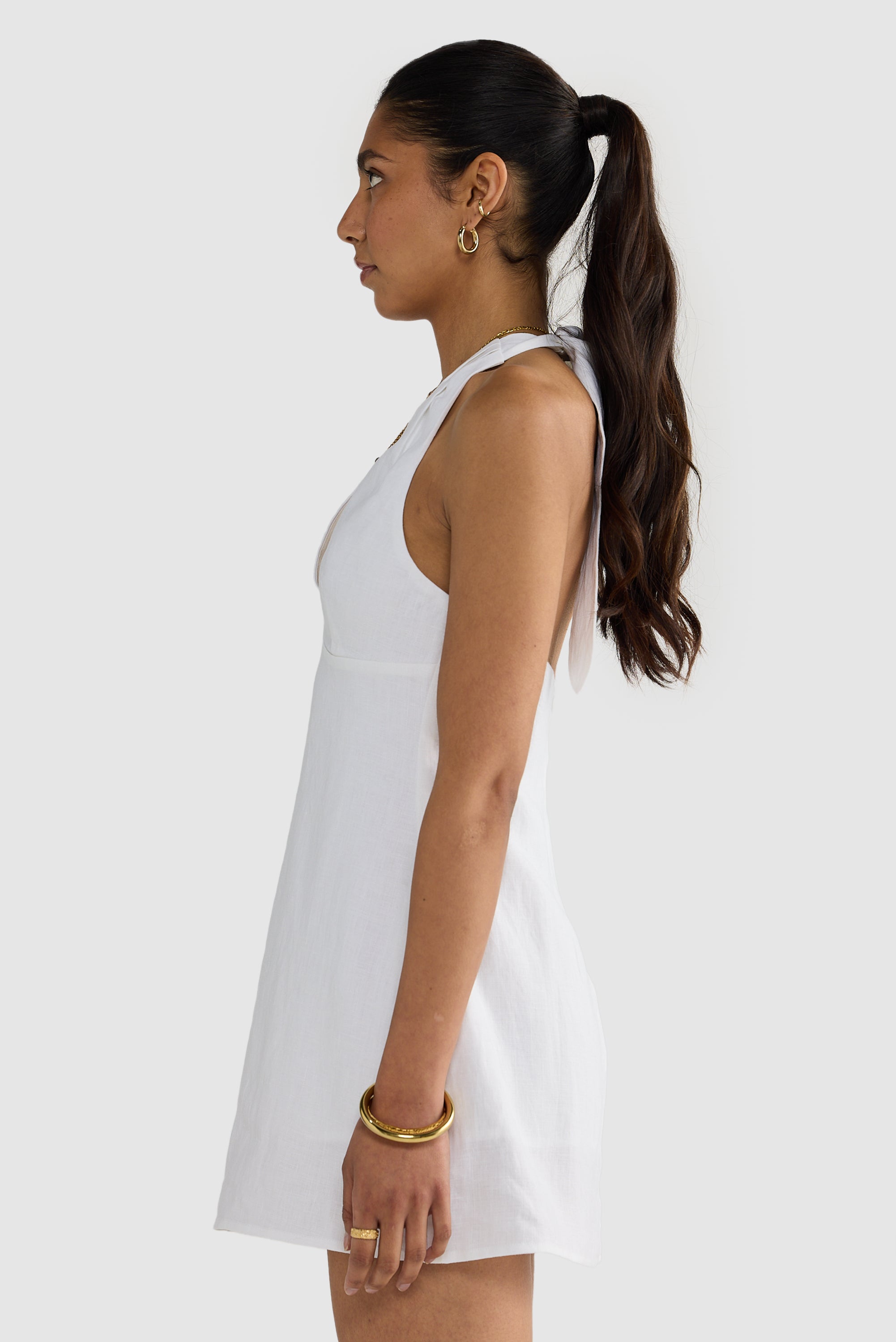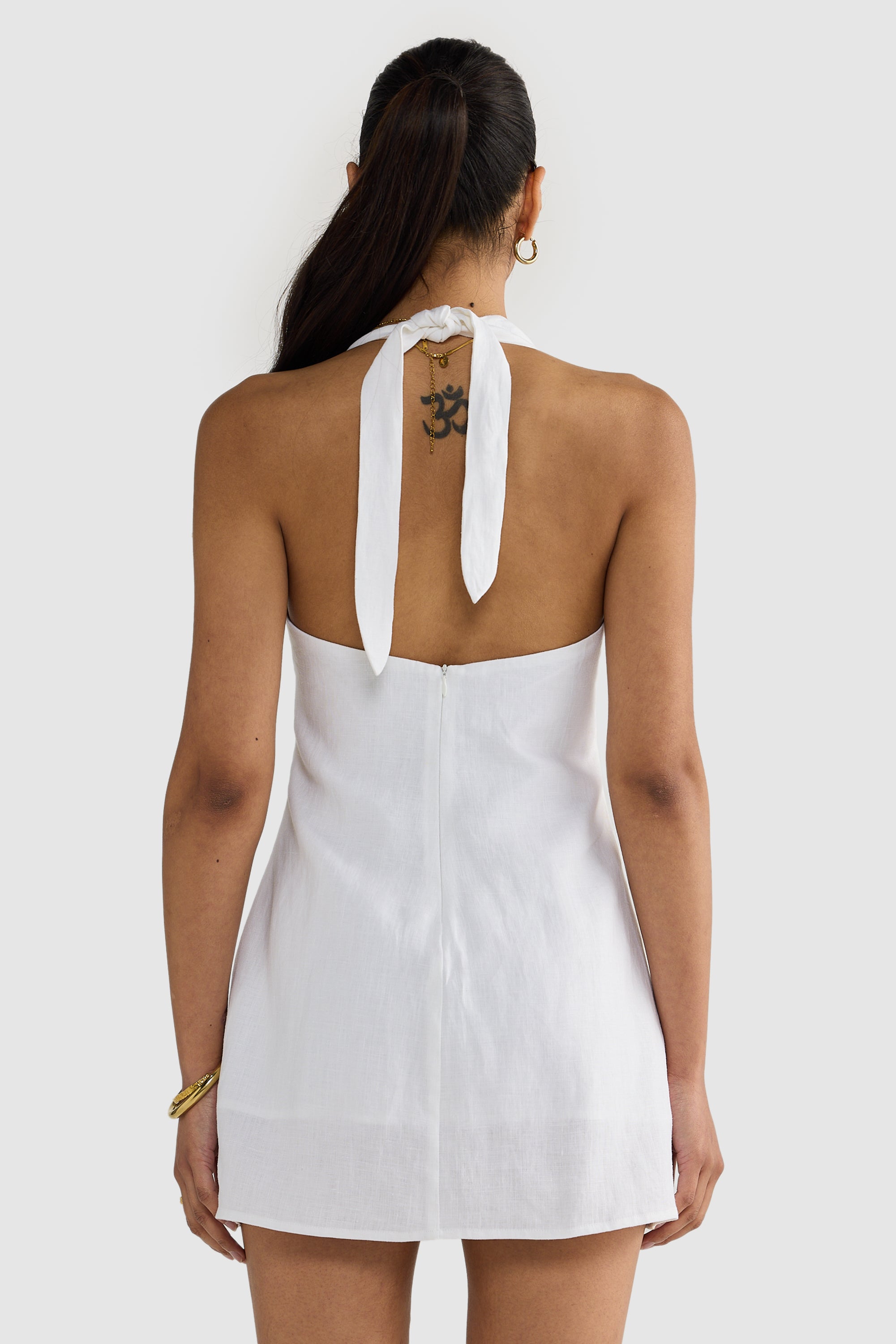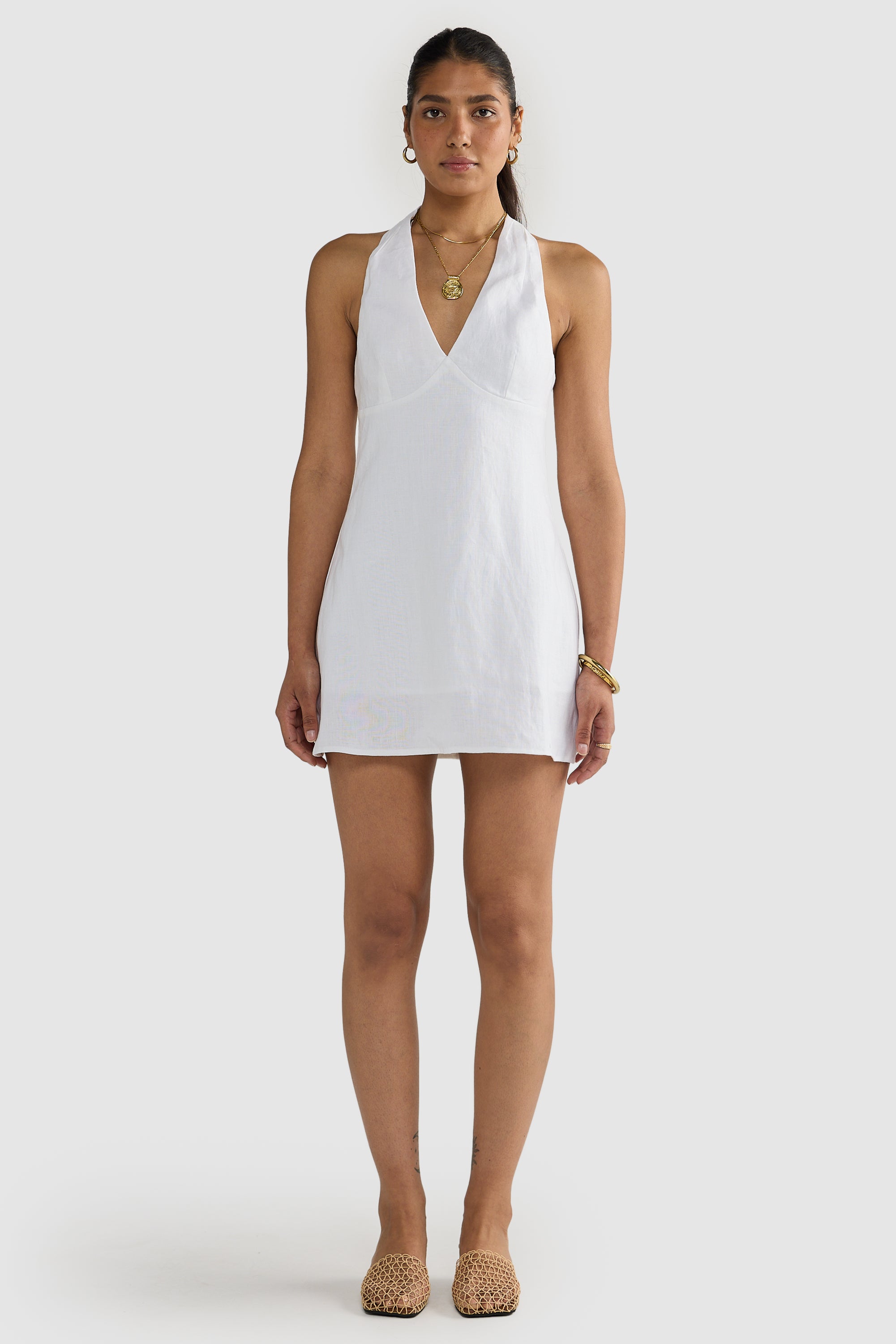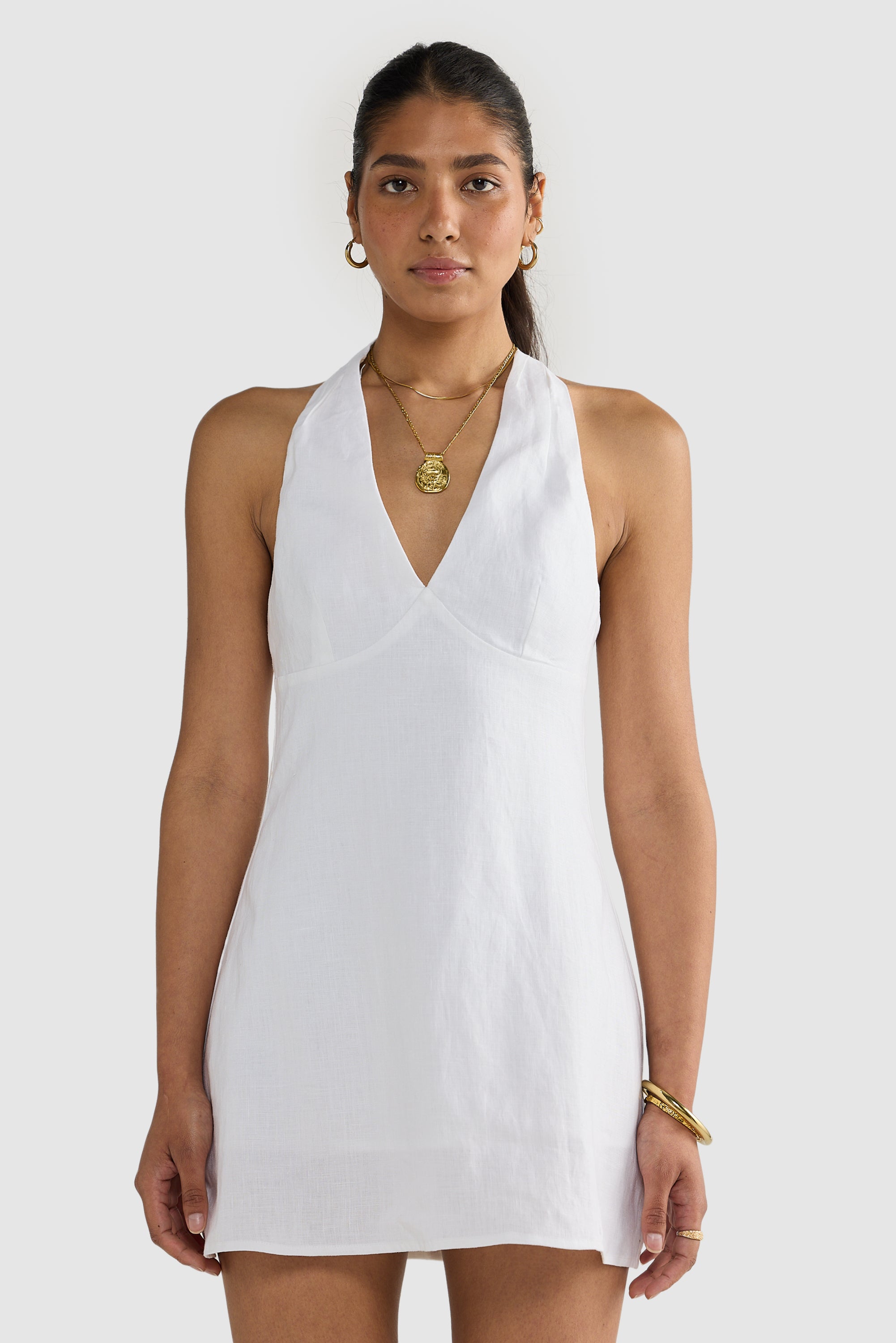 Introducing the Rosa Linen Mini Dress White, designed for day to night styling. With a flattering a-line silhouette and halter neck, this dress is guaranteed to be on high rotation in your summer wardrobe.