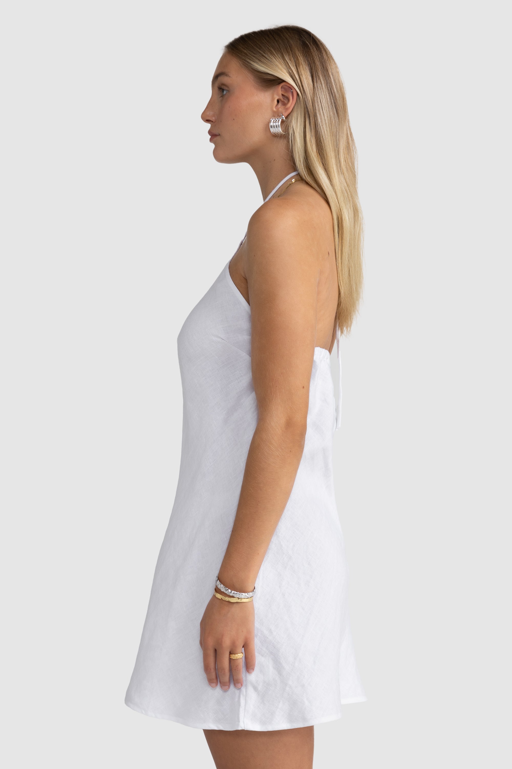 The Zia Linen Mini Cut Dress offers timeless elegance with effortless ease. This halter-style maxi features a flattering bias cut that softly skims the body for a fluid, feminine silhouette. The adjustable neck ties allow for a custom fit, while the minimal back detail adds an understated allure. Perfect for warm days and balmy evenings alike.