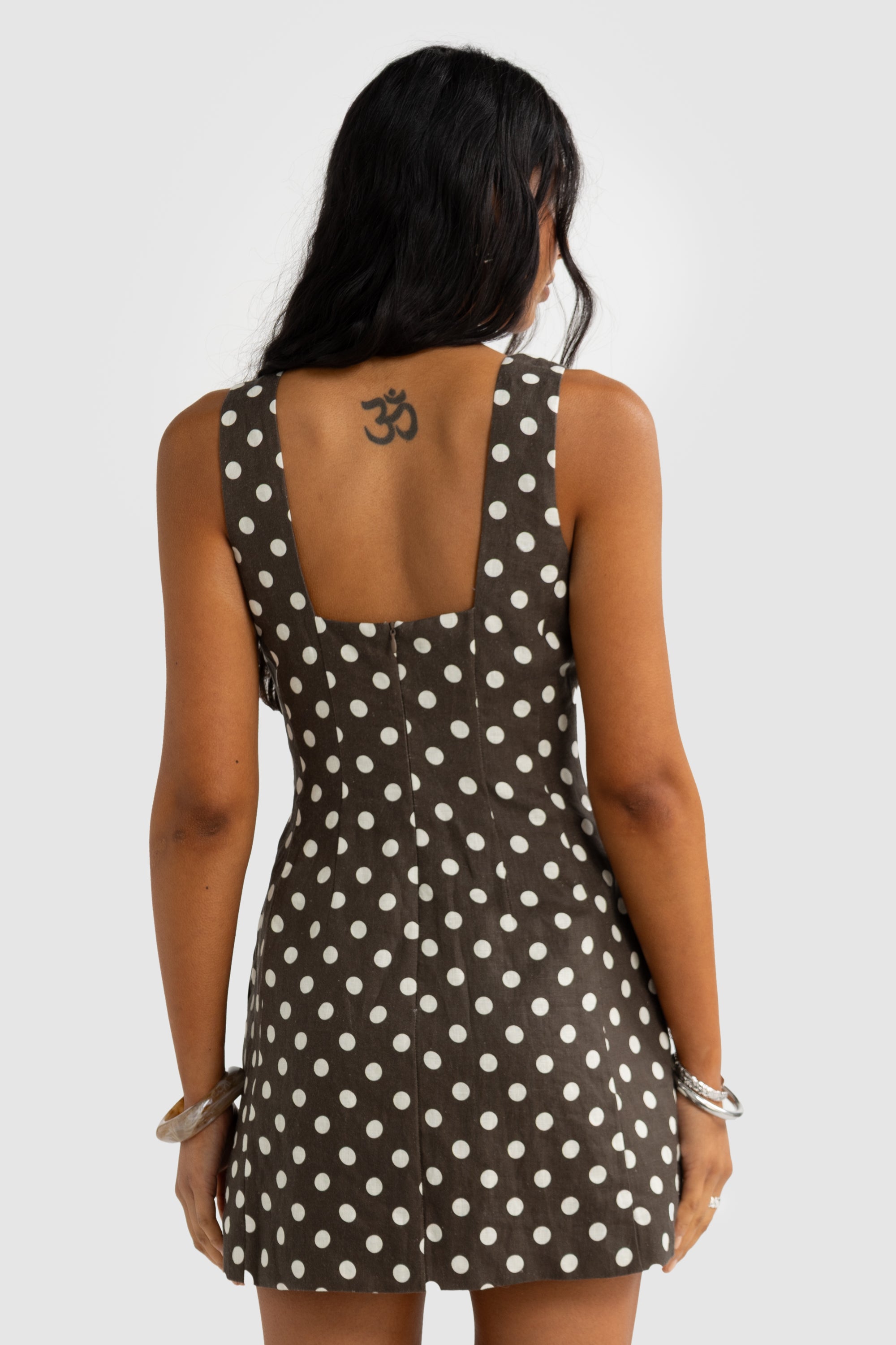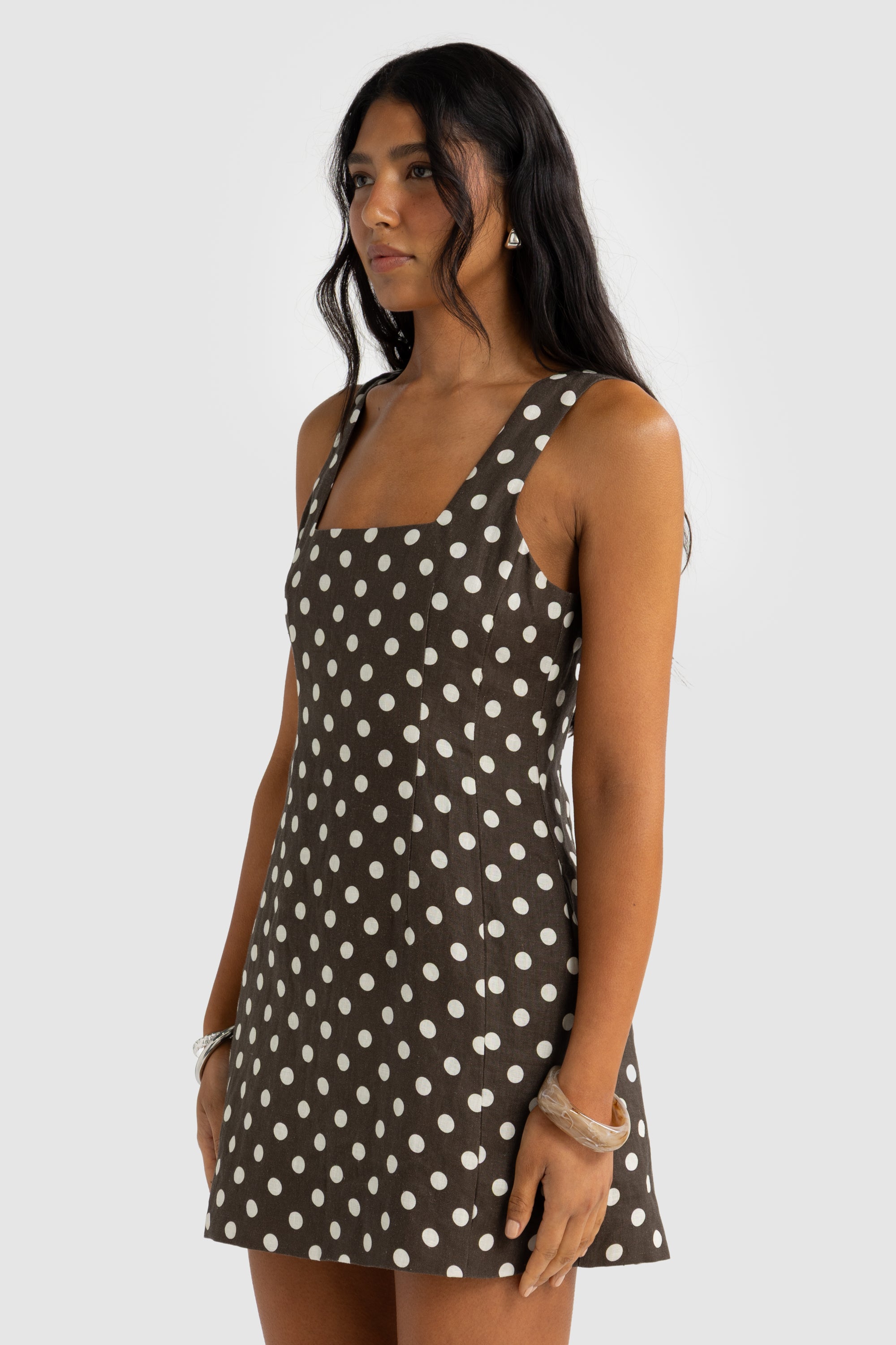 Zoey Linen Mini Dress Carob Polkadot
