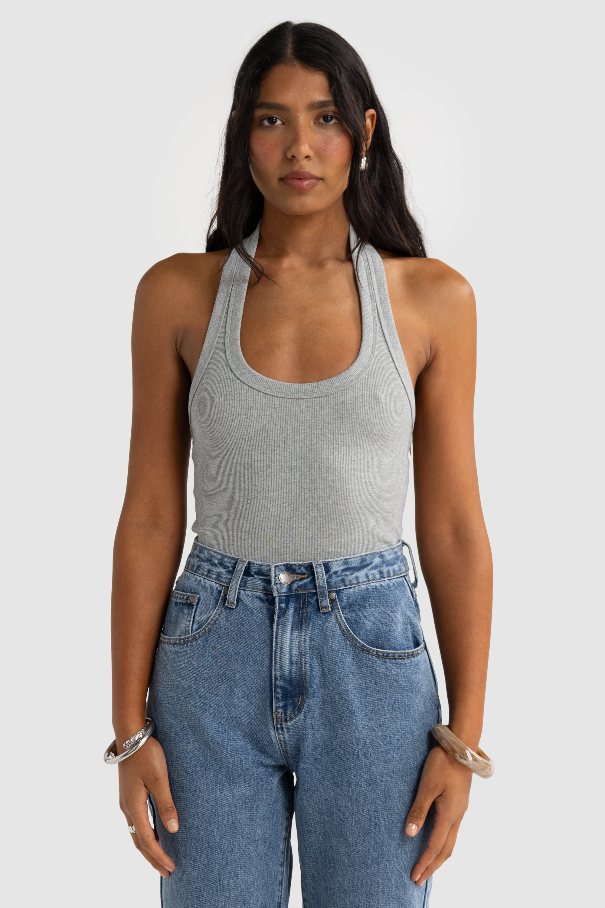 A modern essential with a touch of edge. The Sunday Halter Tank features a flattering scoop neckline and an open back halter silhouette that enhances your natural shape. Crafted from premium thick ribbed cotton, it offers a supportive, body-hugging fit that feels both soft and structured. Perfect for everyday wear, pairing seamlessly with denim or tailored pieces.