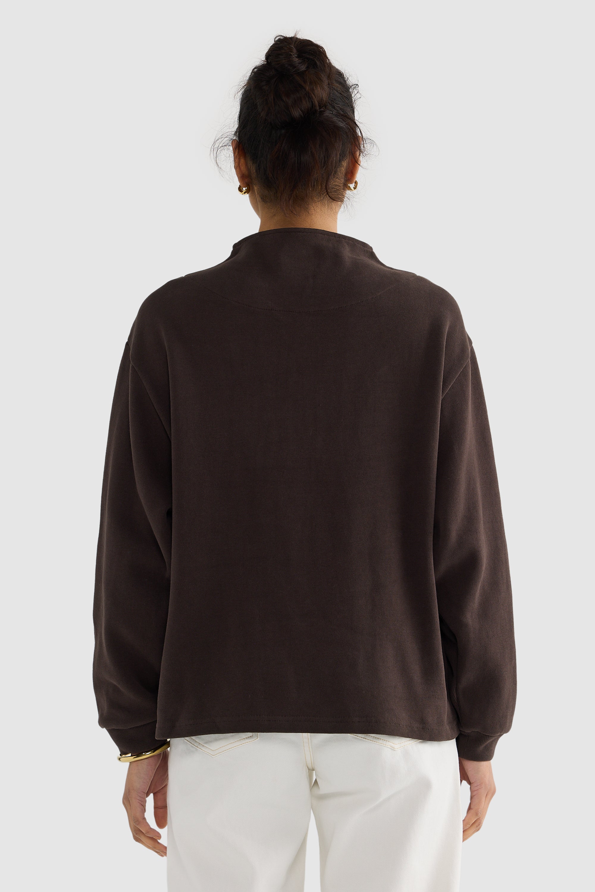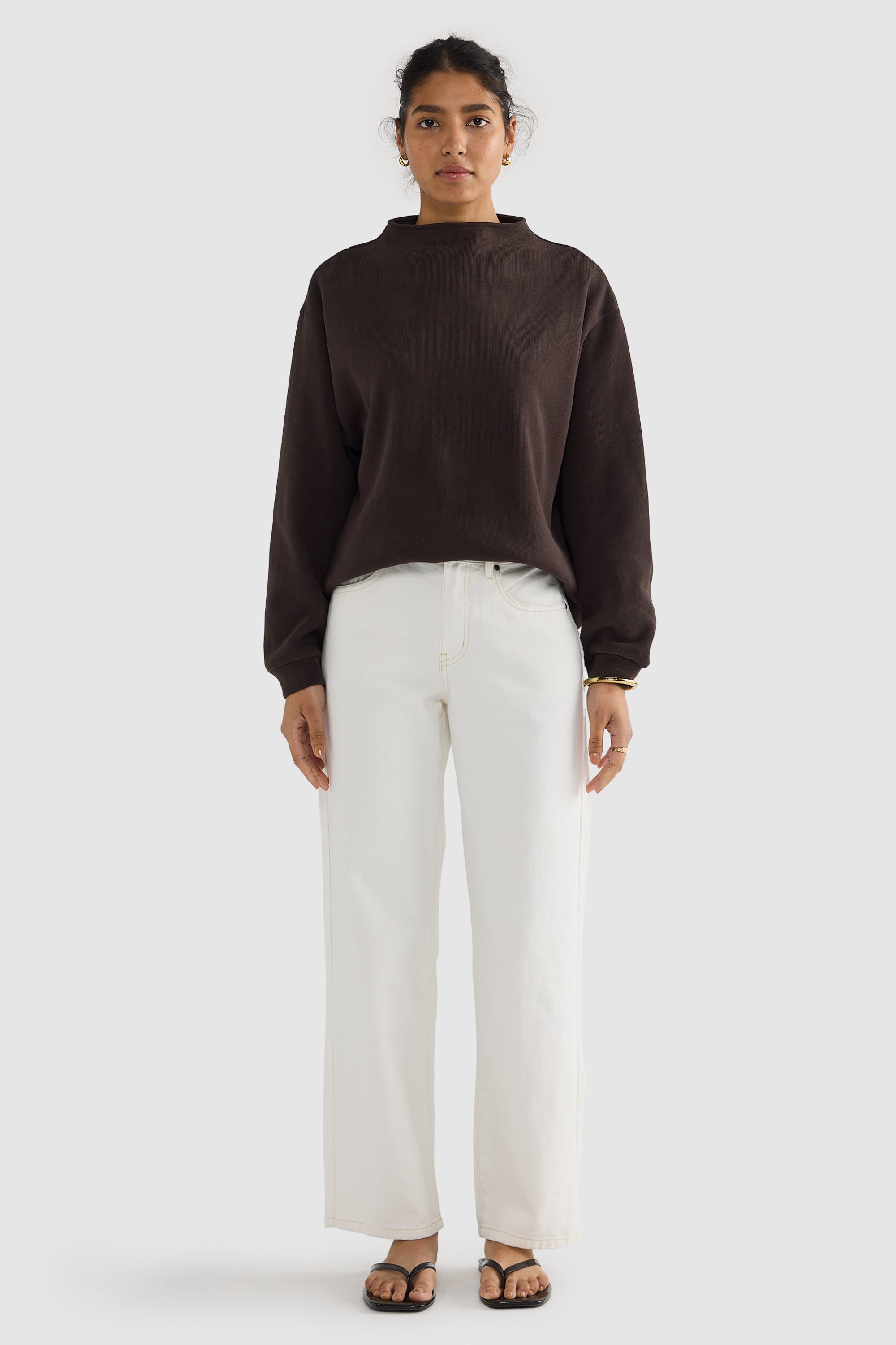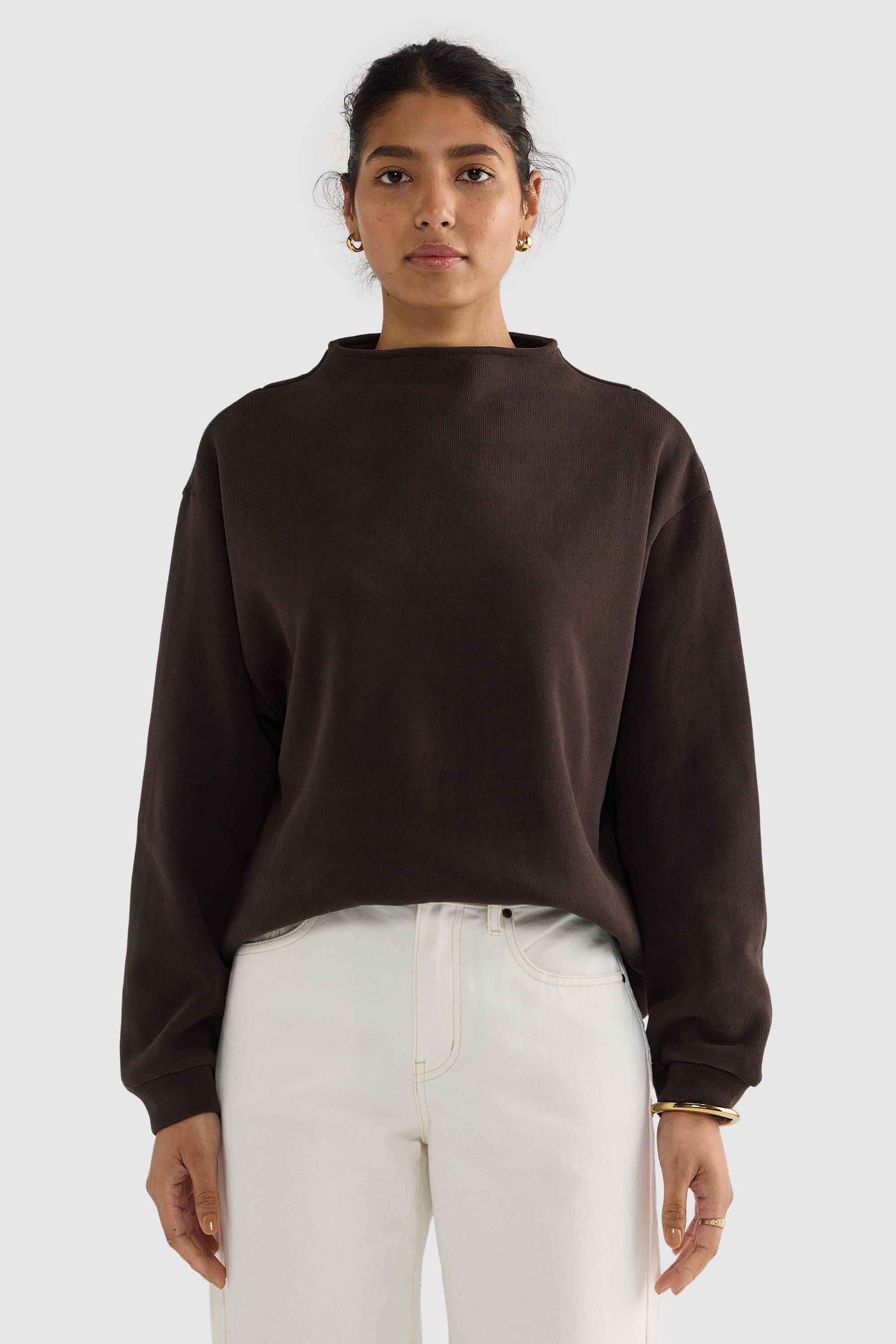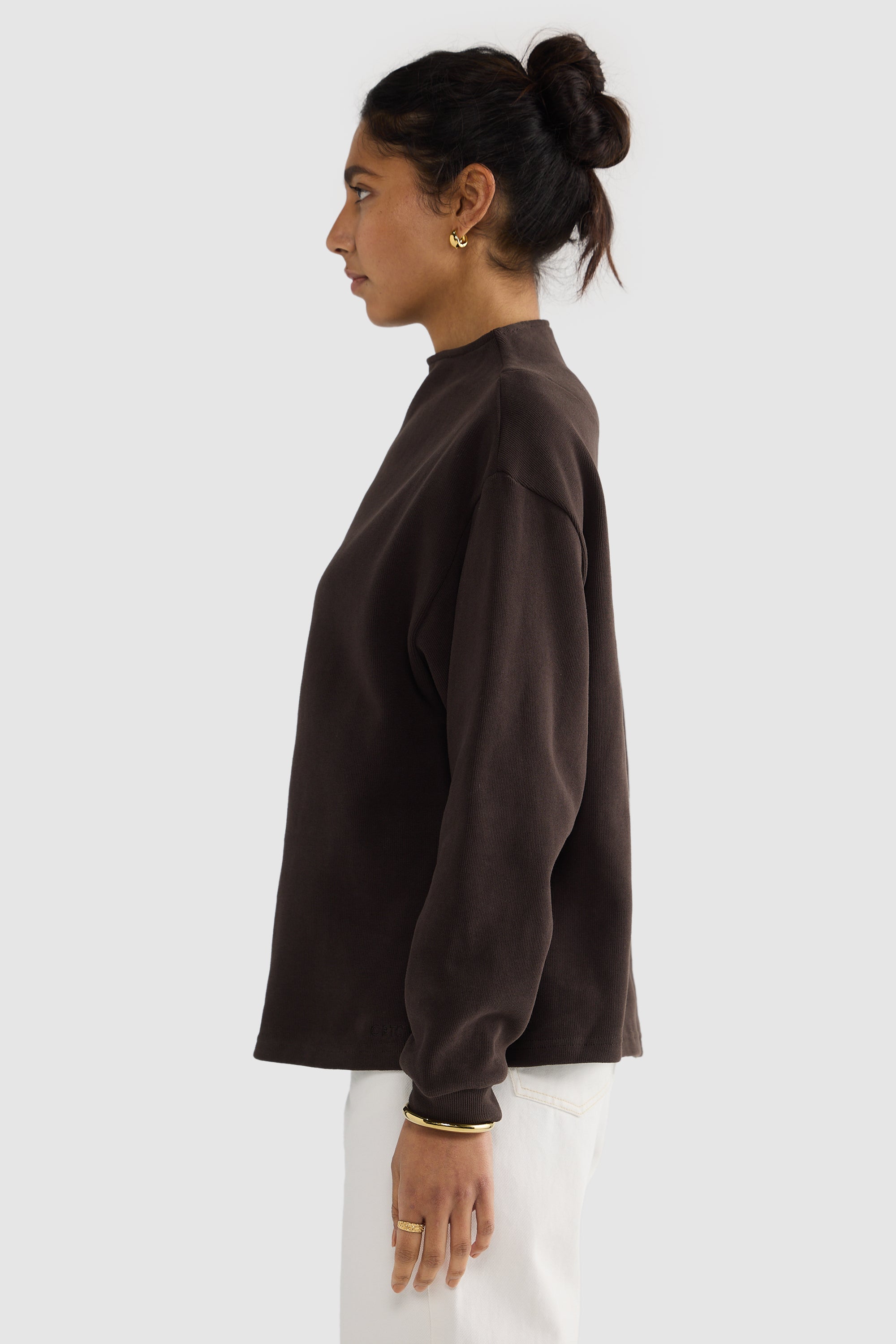 The Ava High Necked Ribbed Jumper Carob is a premium grown-on neck sweater designed for comfort. This piece is crafted from high quality brushed cotton which makes it the perfect every day sweat.