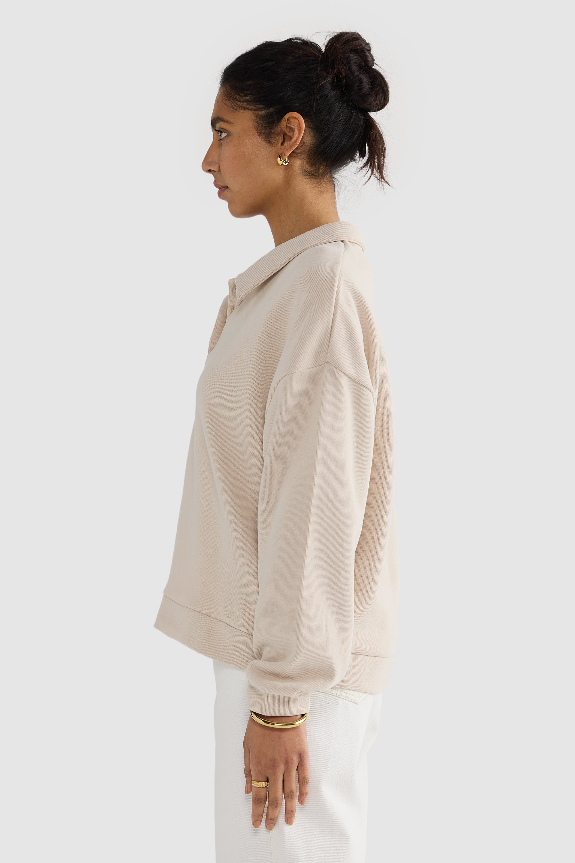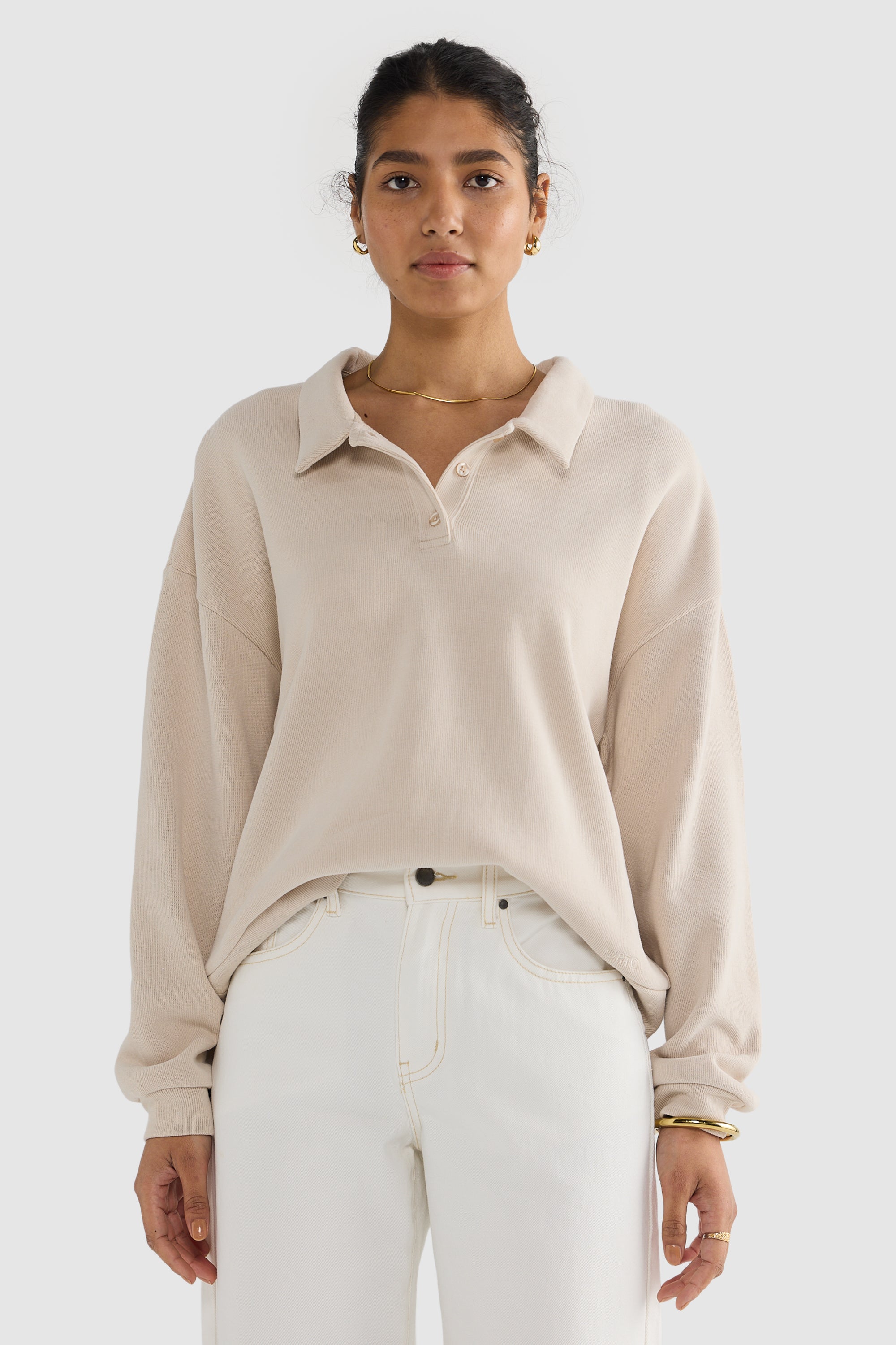 Step out in comfort with the Ava Polo Sweater, a timeless blend of relaxed style and everyday ease. Crafted from brushed cotton with a subtle rib texture, this sweater offers a soft elevated feel. Featuring a button-front polo neckline and tonal ORTC monogram embroidery, it delivers refined details. Designed to be worn as a matching set with our Ava Shorts or Ava Pants.
