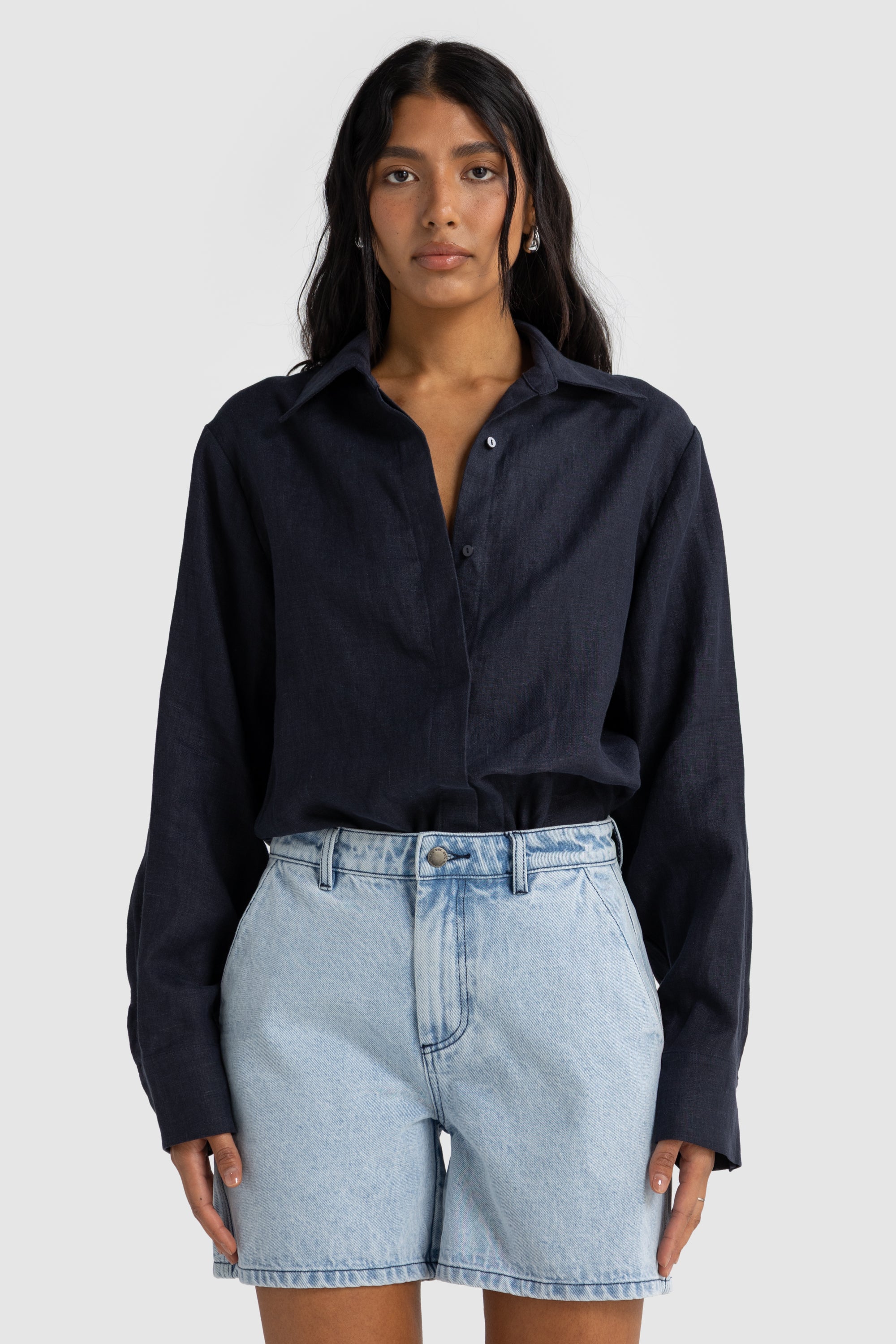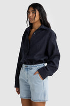 Meet your new everyday essential, the Bailie Denim Short. Crafted from mid-weight, 100% cotton denim, this style offers a structured yet comfortable fit that’s perfect for any occasion. Featuring self belt loops, cutaway pockets, and a zip fly front, it’s finished with tonal stitching, a branded shank button, and a white leather logo patch on the back waistband for a timeless touch.