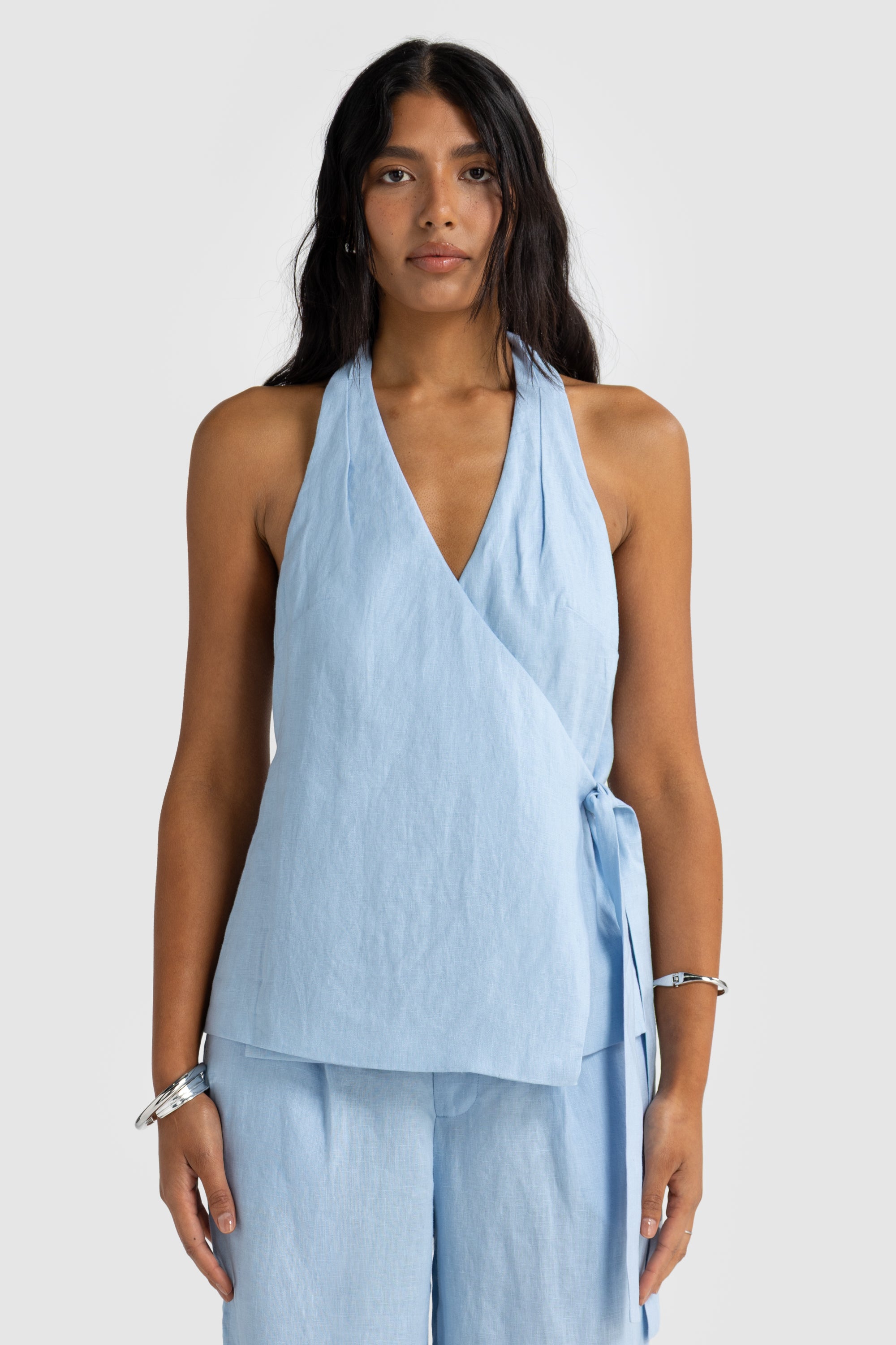 Chic and effortlessly feminine, the Elise Linen Wrap Top is crafted from breathable mid-weight linen. Featuring a halter neckline, plunging front, and open back, it ties at the waist with a matching wrap belt for a flattering fit. Pair it with any of our denim bottoms or linen shorts for a coordinated summer look.