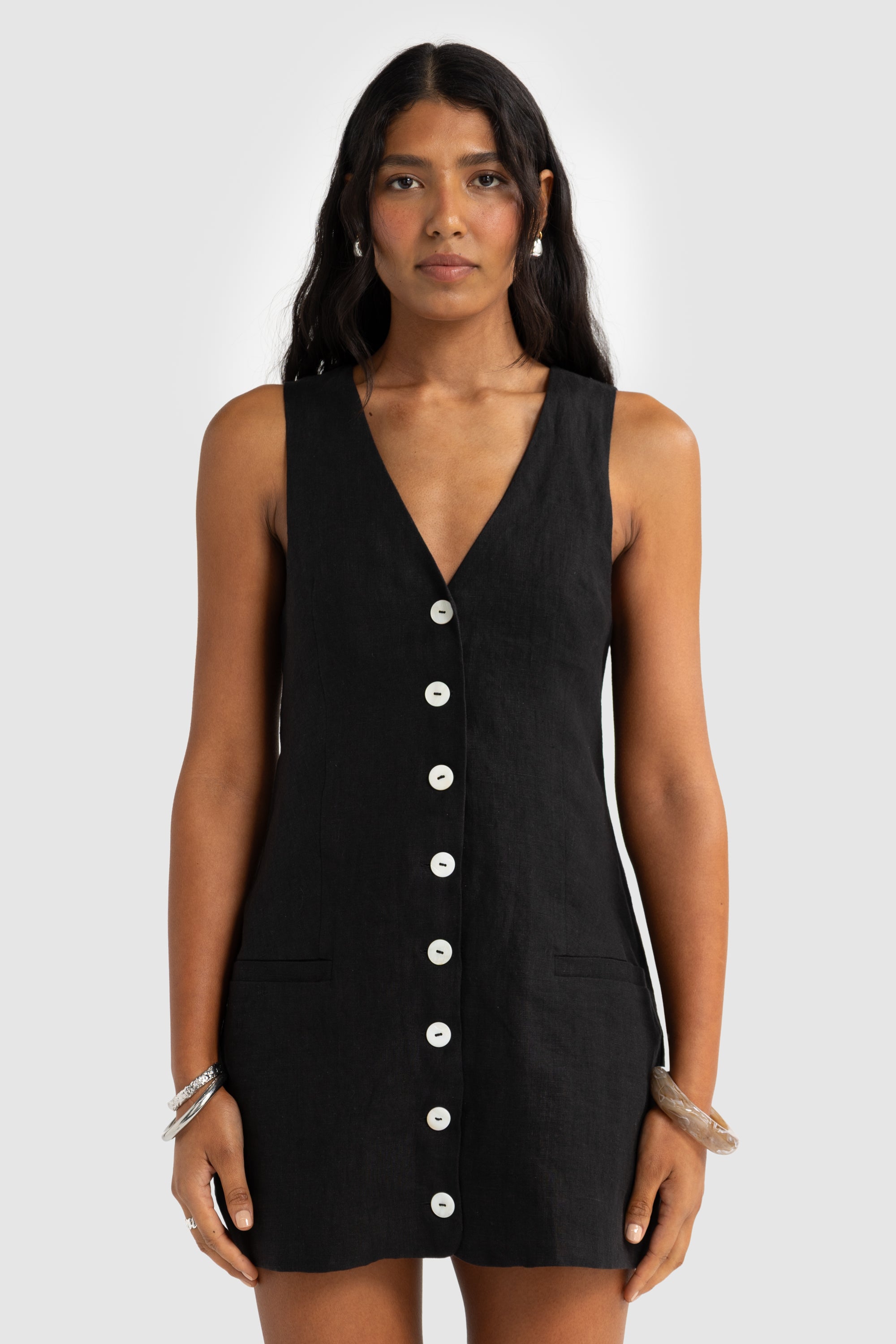 Timeless and effortlessly cool, the Koda Linen Mini is your go-to for warm-weather dressing. Made from 100% linen and fully lined, it features a flattering V-neckline, contrast buttons, and a clean, structured silhouette. A fabric tie at the back lets you cinch the waist for a more tailored fit. Style with heels or sandals for a versatile look.