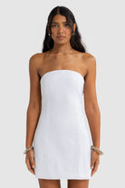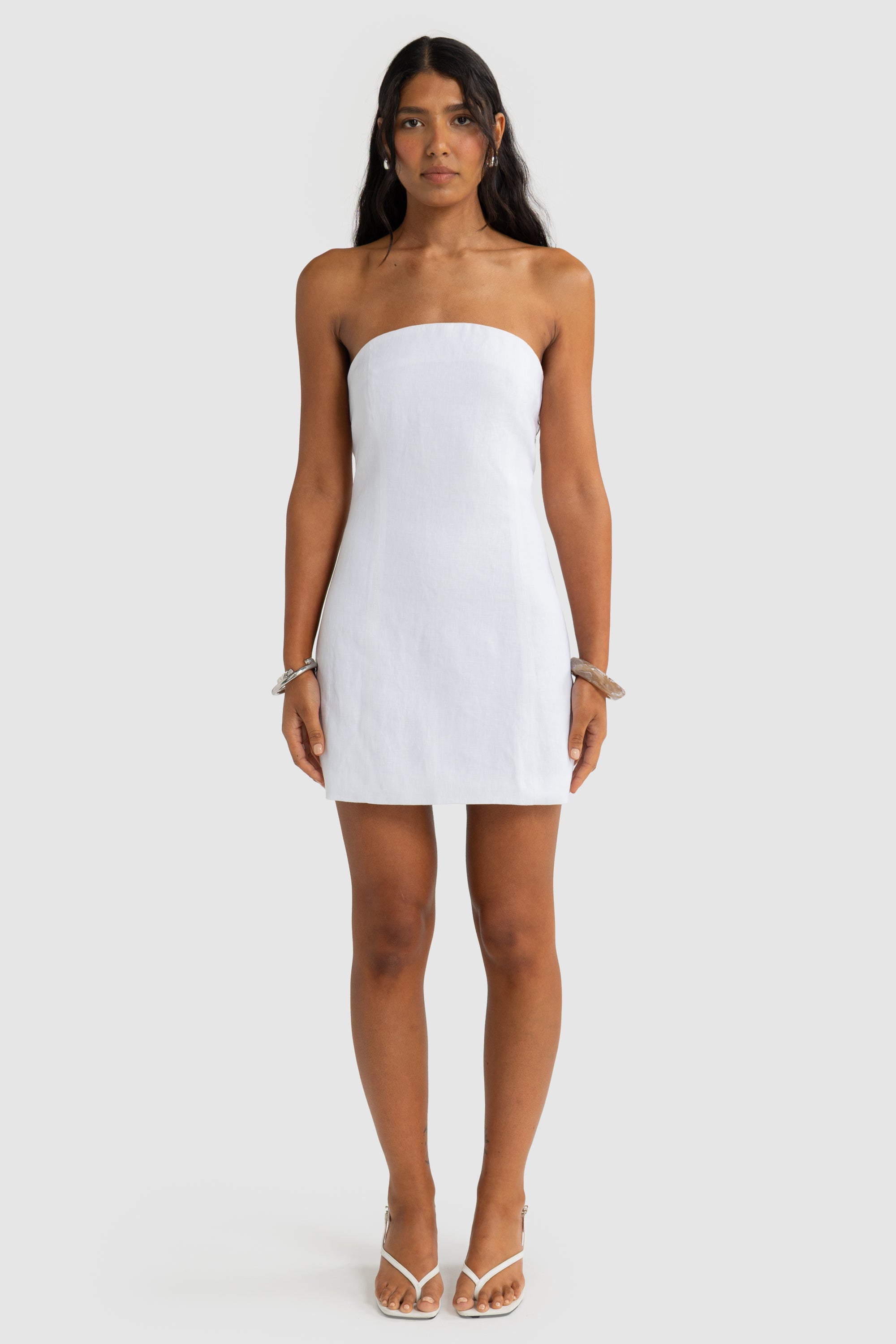 The Savannah Linen Strapless Mini Dress features a clean, strapless design with a softly sculpted straight neckline that gently curves over the bust, it creates a flattering, structured silhouette. The minimal neckline lends a modern, elegant finish. Style it with heels for an elevated look or keep it relaxed with a pair of sandals.
