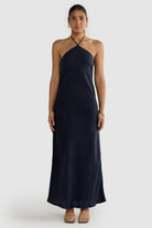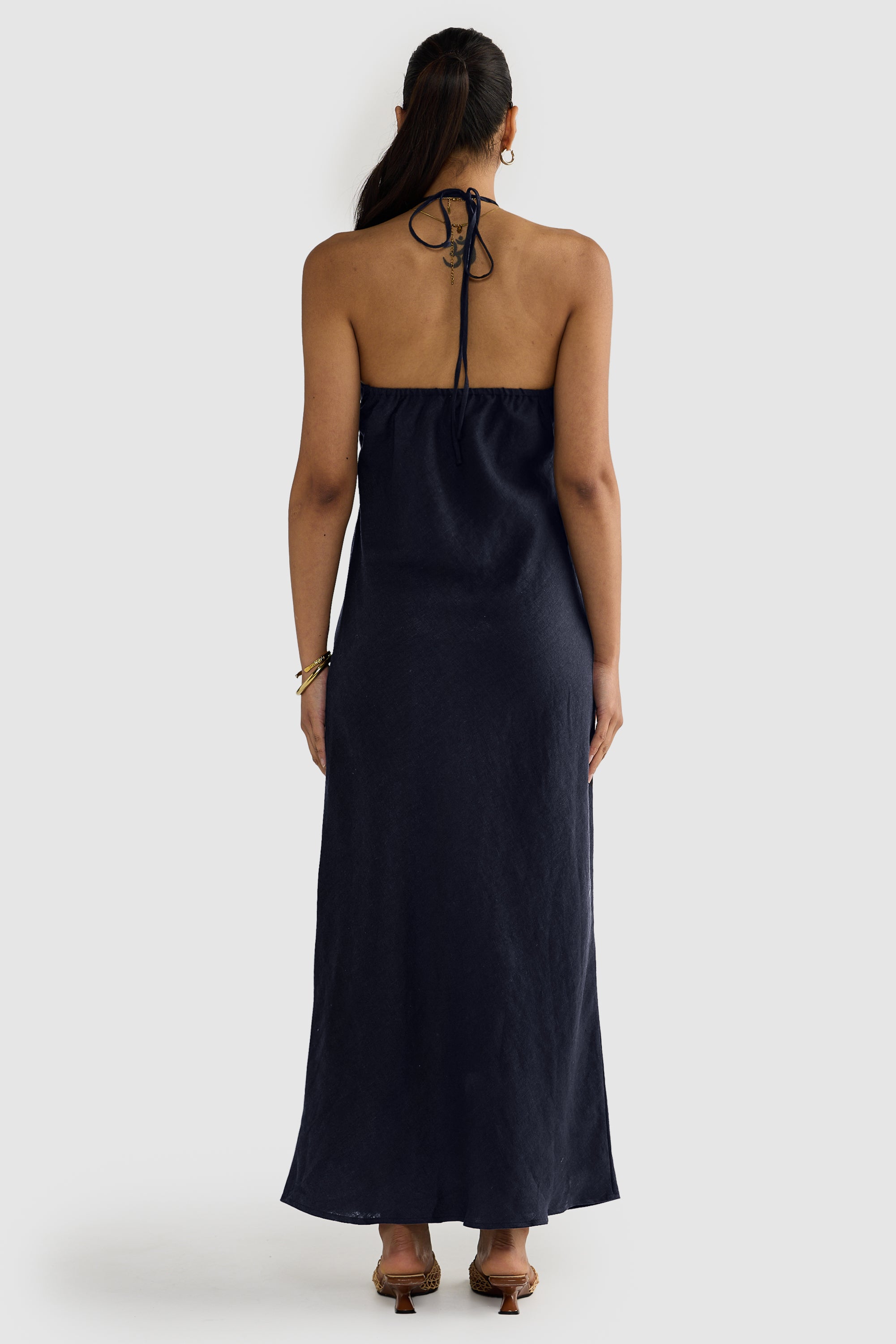 The Zia Linen Bias Cut Dress offers timeless elegance with effortless ease. This halter-style maxi features a flattering bias cut that softly skims the body for a fluid, feminine silhouette. The adjustable neck ties allow for a custom fit, while the minimal back detail adds an understated allure. Perfect for warm days and balmy evenings alike.