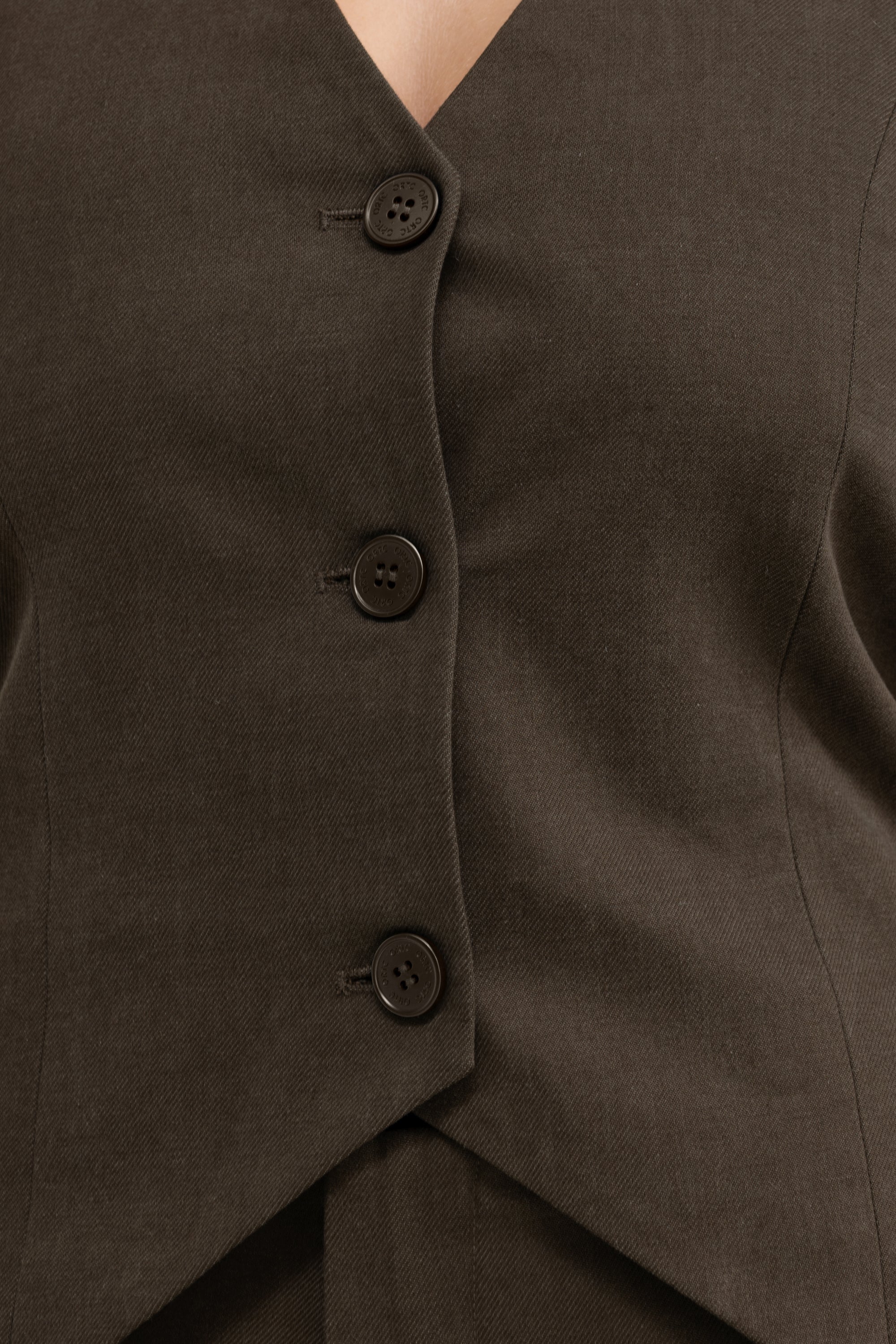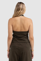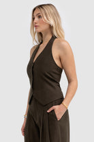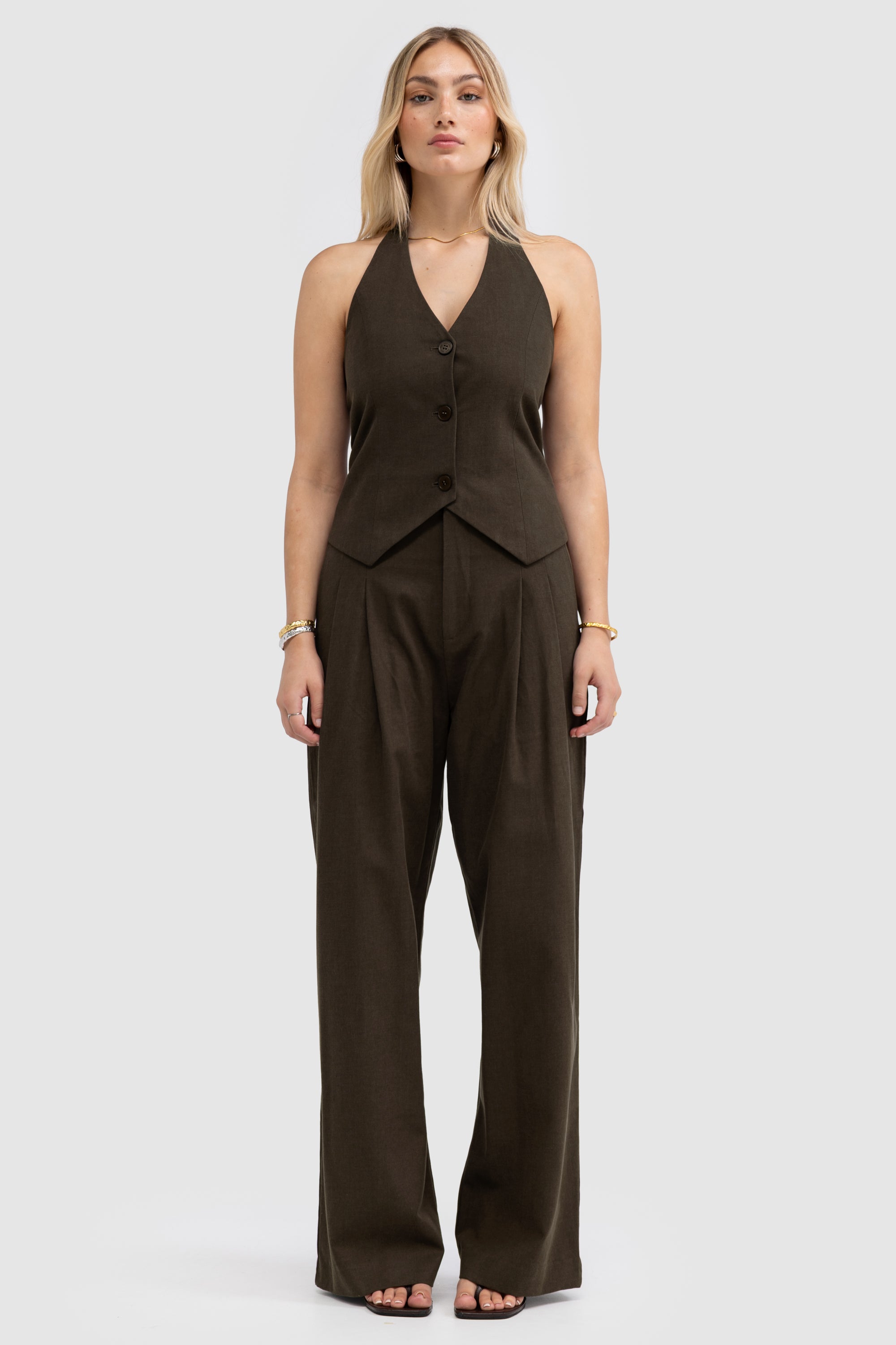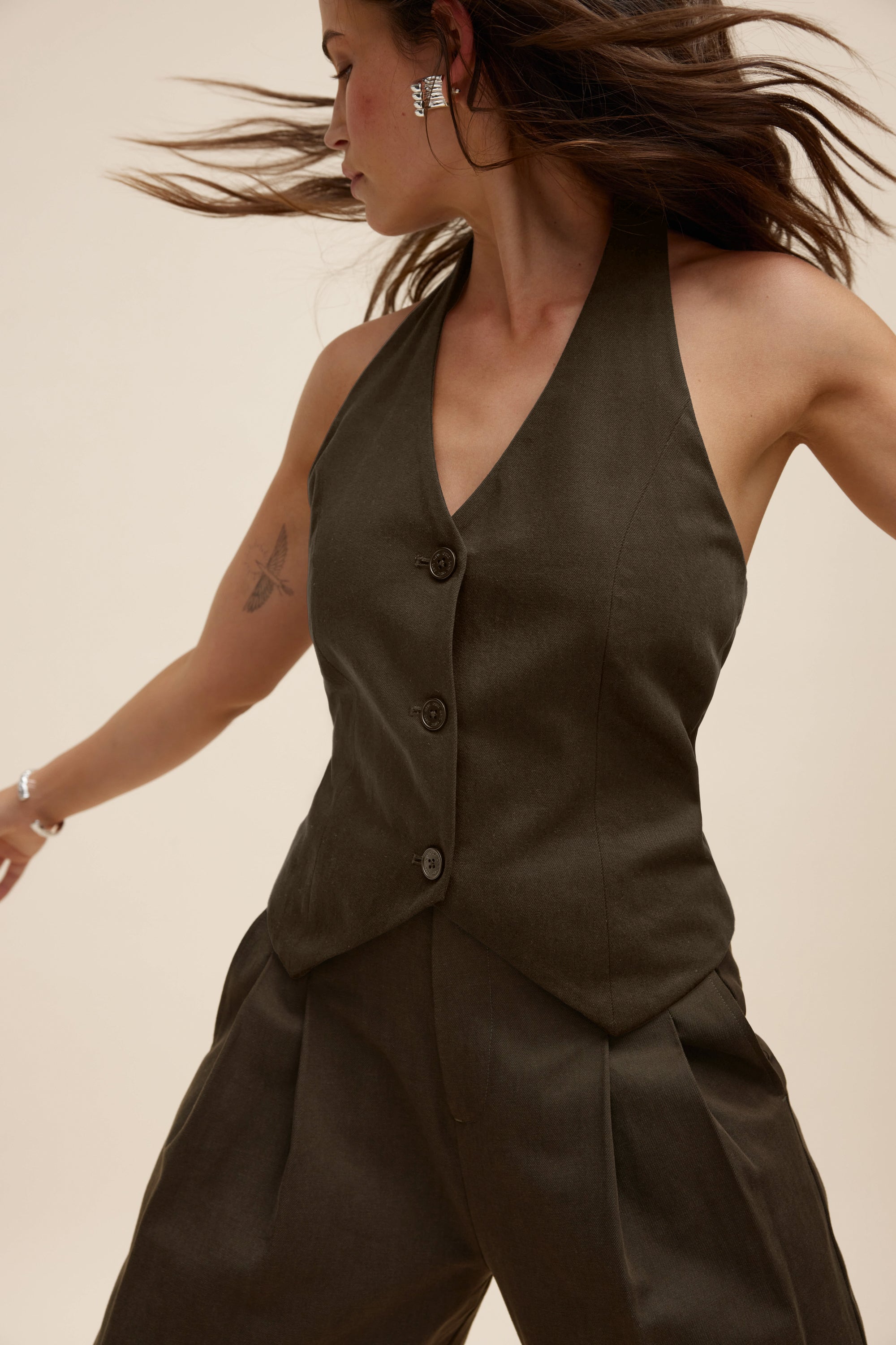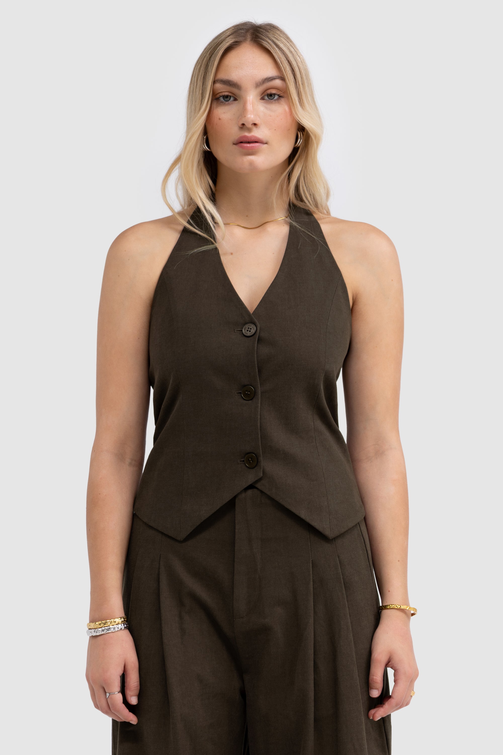 The Aubrey Halter Waistcoat Cedar is a modern take on timeless tailoring. Cut from a refined suiting-style fabric, it features a halter neckline, V-front design, and three-button closure for a sleek, structured fit. An elasticated back ensures all-day comfort, while the classic waistcoat silhouette brings a feminine twist on classic suiting.