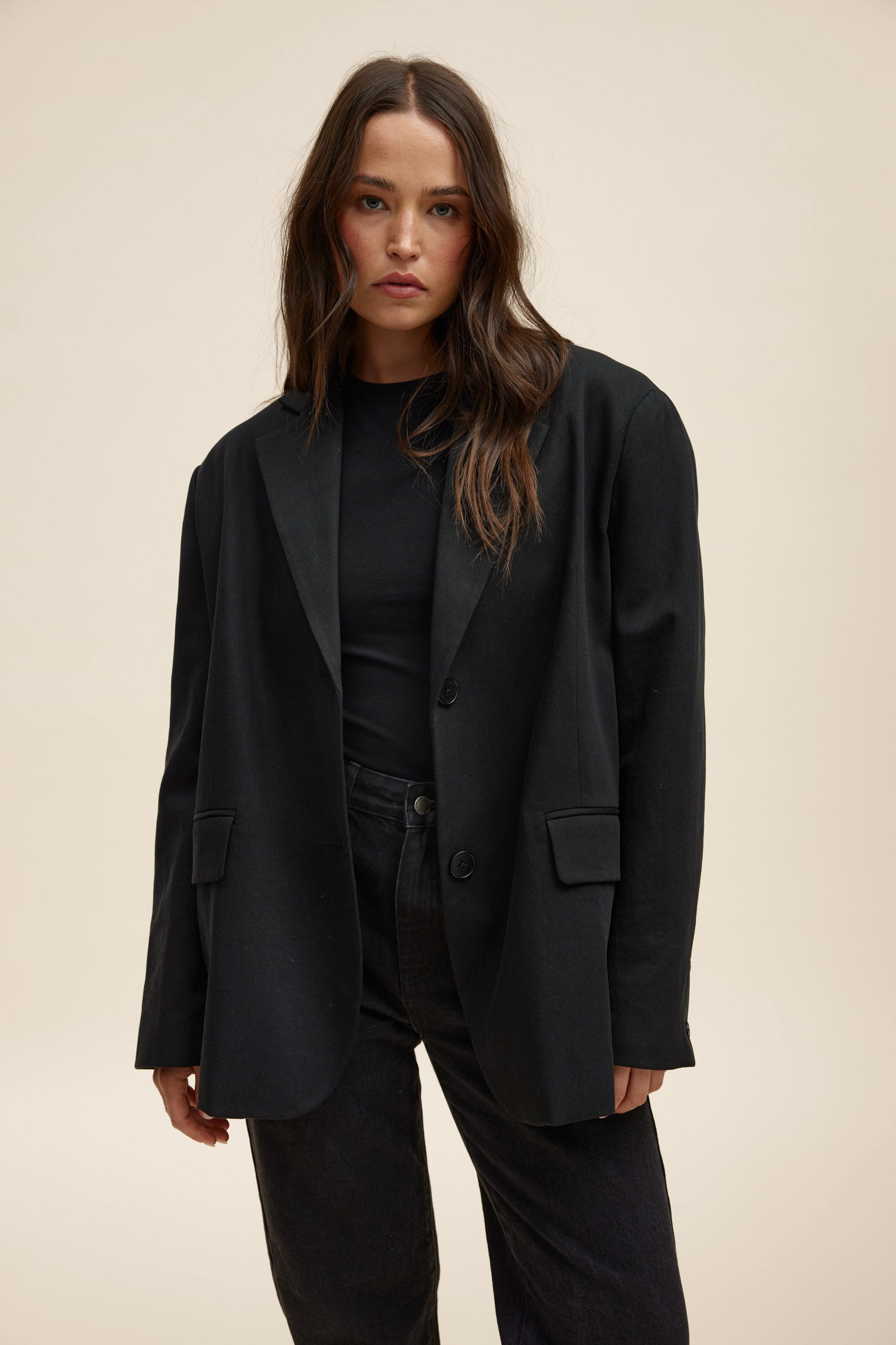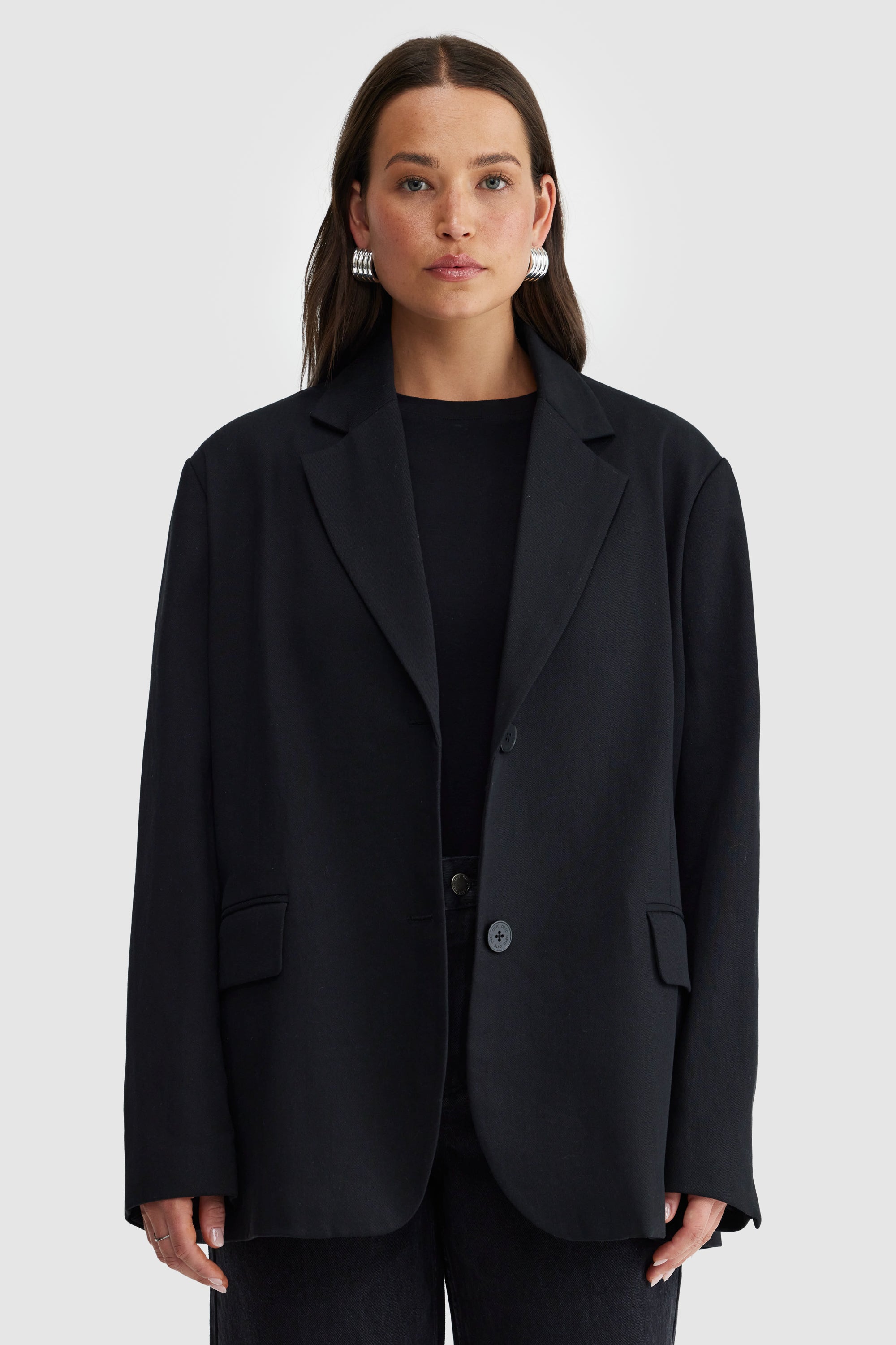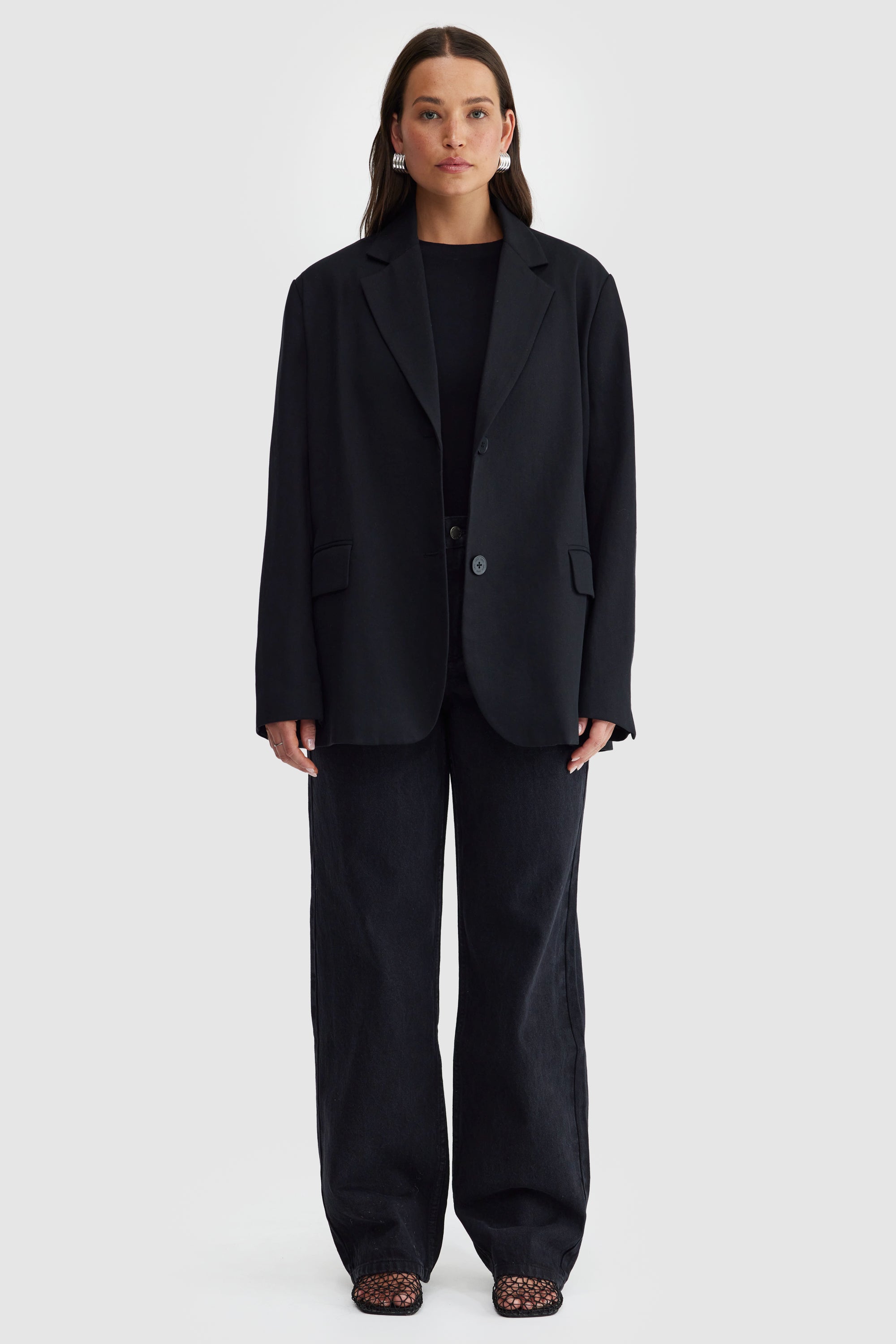 The Aubrey Blazer Black is an elevated essential with a modern, oversized longline silhouette. A relaxed box fit with structured shoulder pads adds refined tailoring, while custom debossed logo buttons on the front and sleeves provide a distinctive, polished finish. An effortless layer for refined, everyday styling.