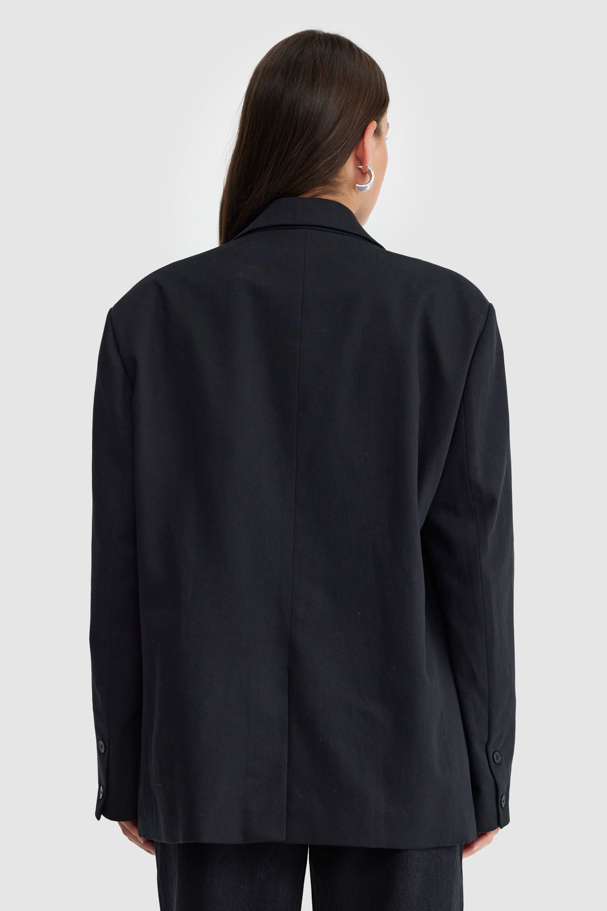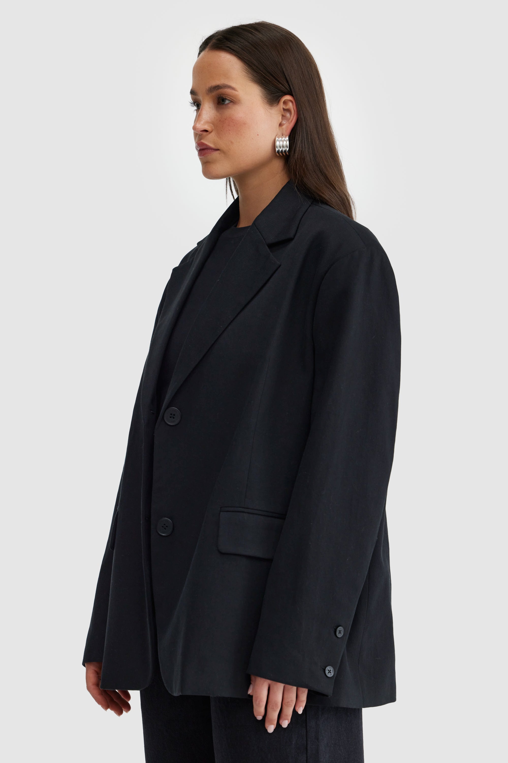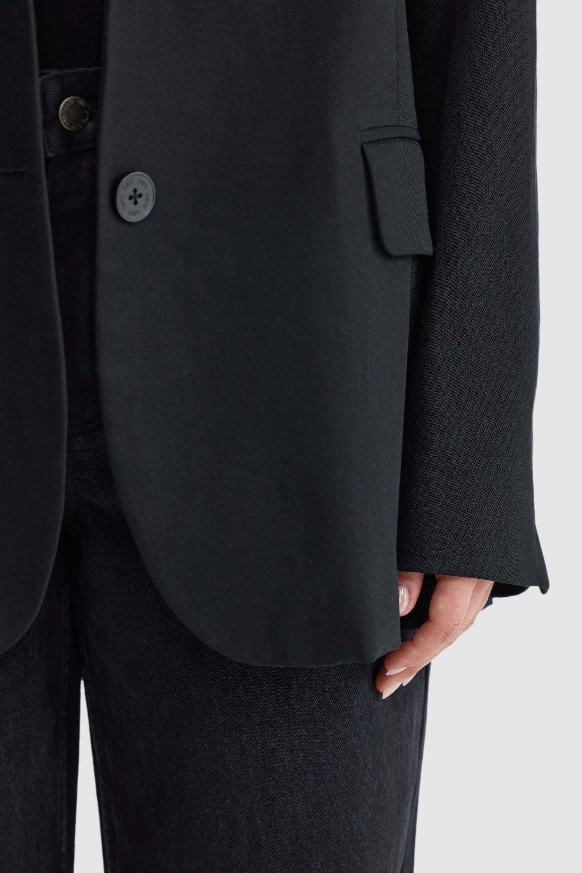 The Aubrey Blazer Black is an elevated essential with a modern, oversized longline silhouette. A relaxed box fit with structured shoulder pads adds refined tailoring, while custom debossed logo buttons on the front and sleeves provide a distinctive, polished finish. An effortless layer for refined, everyday styling.