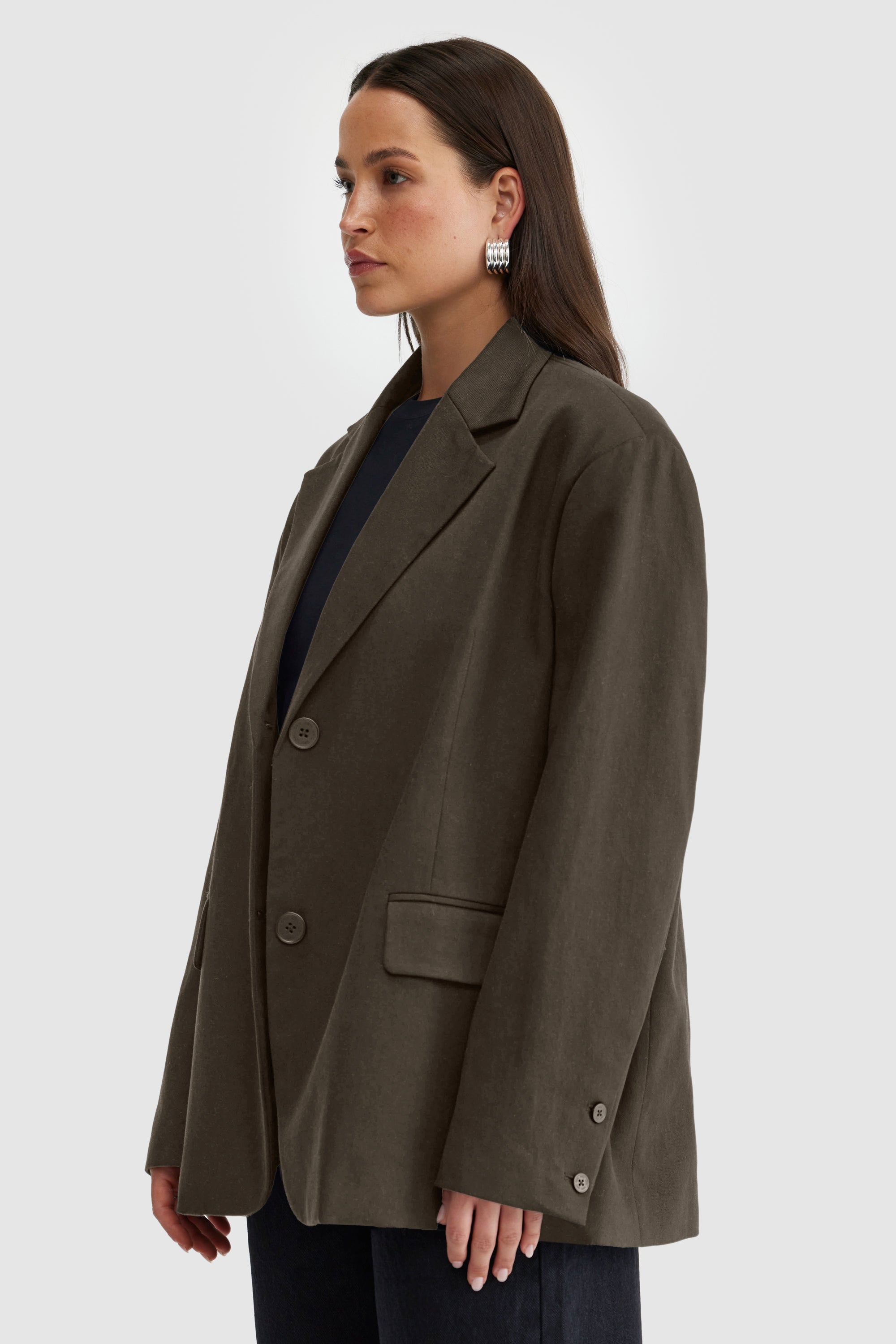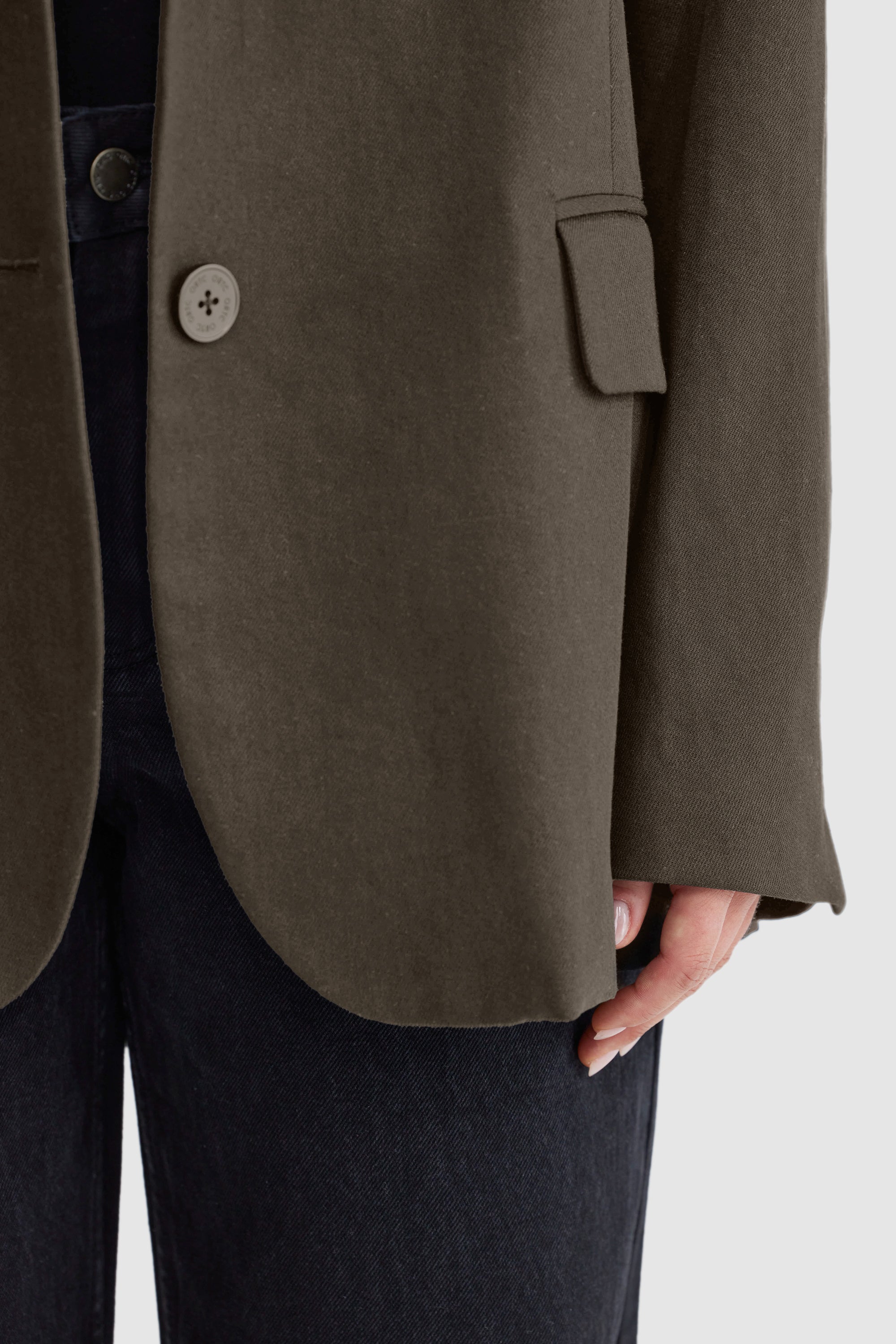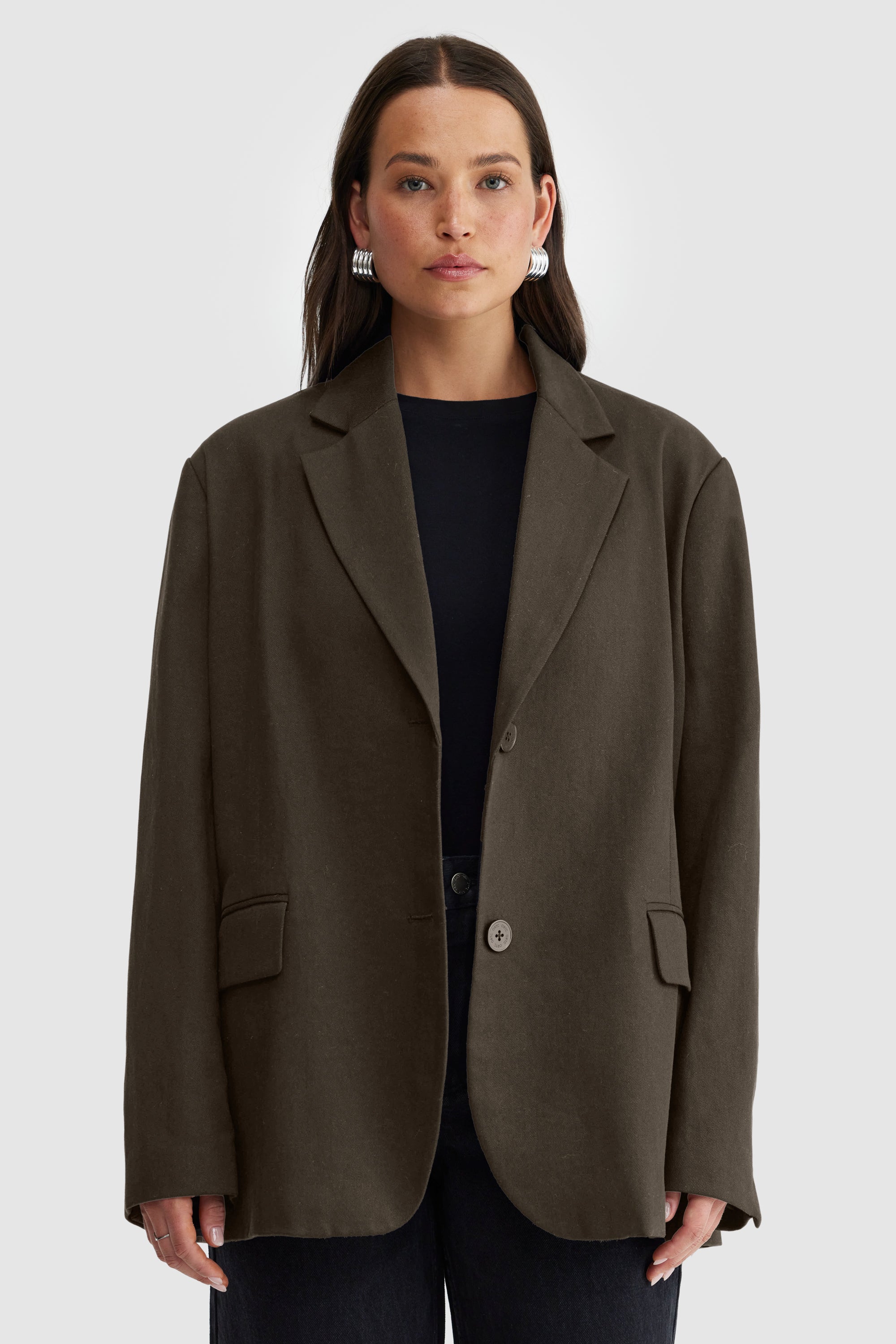 The Aubrey Blazer Cedar is an elevated essential with a modern, oversized longline silhouette. A relaxed box fit with structured shoulder pads adds refined tailoring, while custom debossed logo buttons on the front and sleeves provide a distinctive, polished finish. An effortless layer for refined, everyday styling.