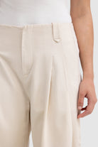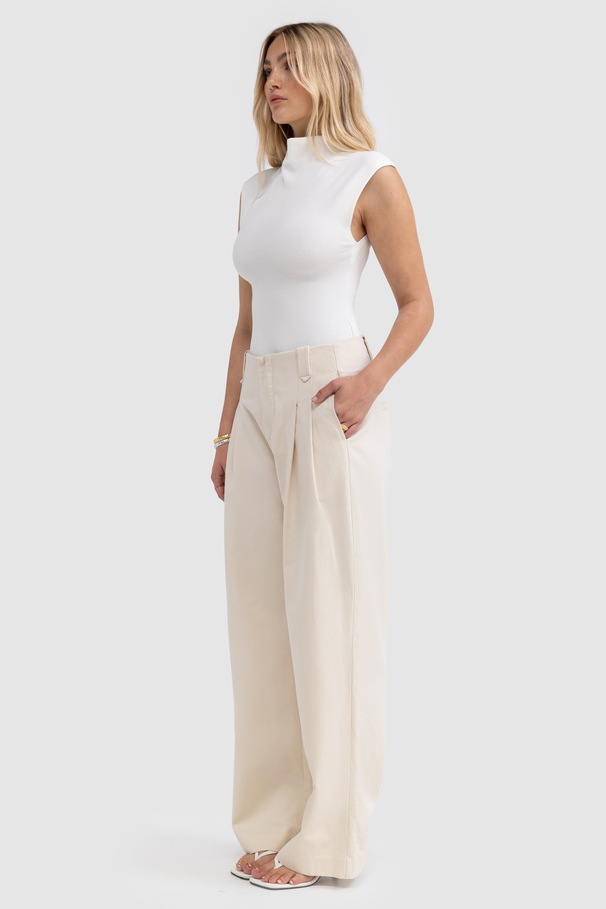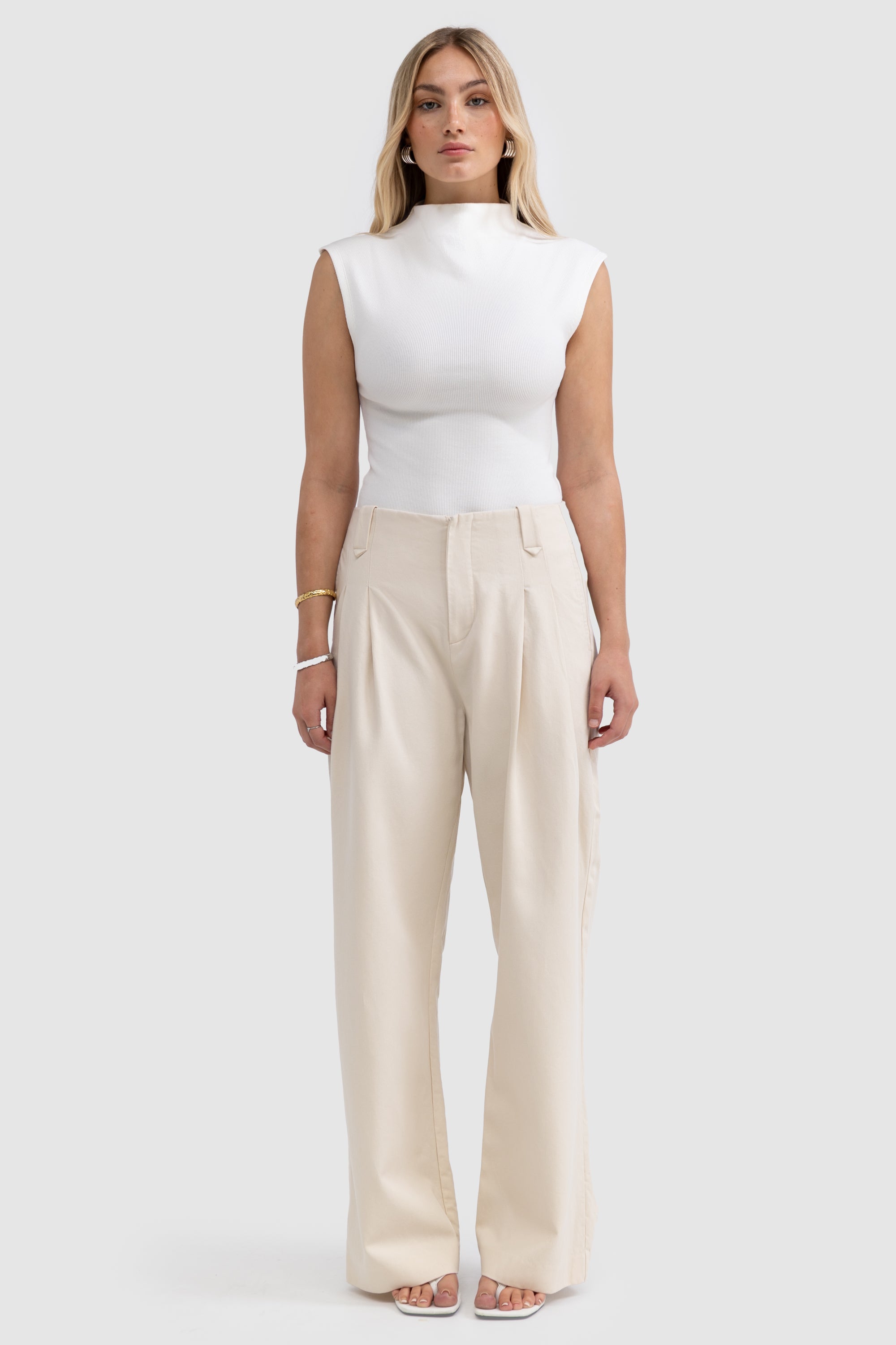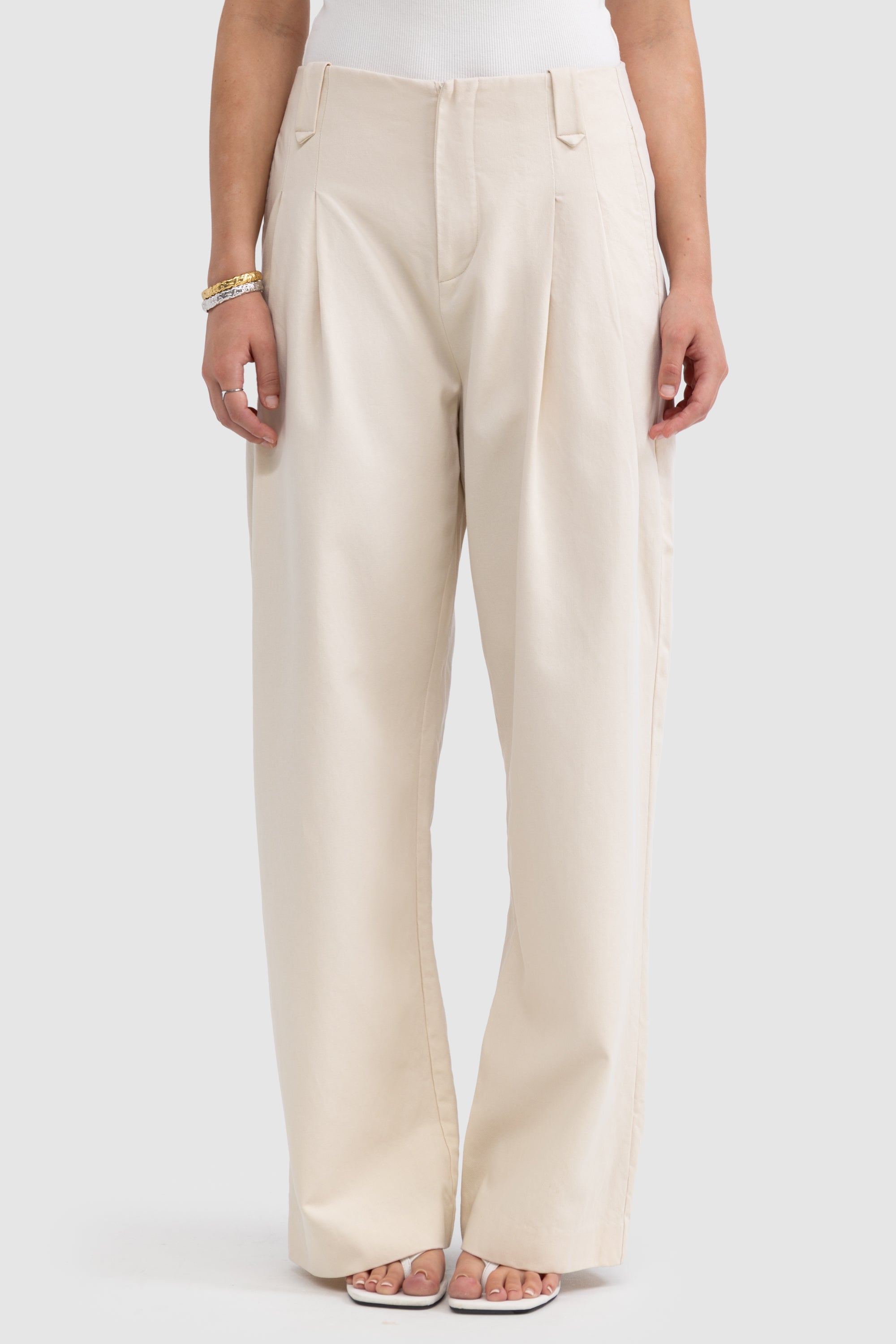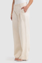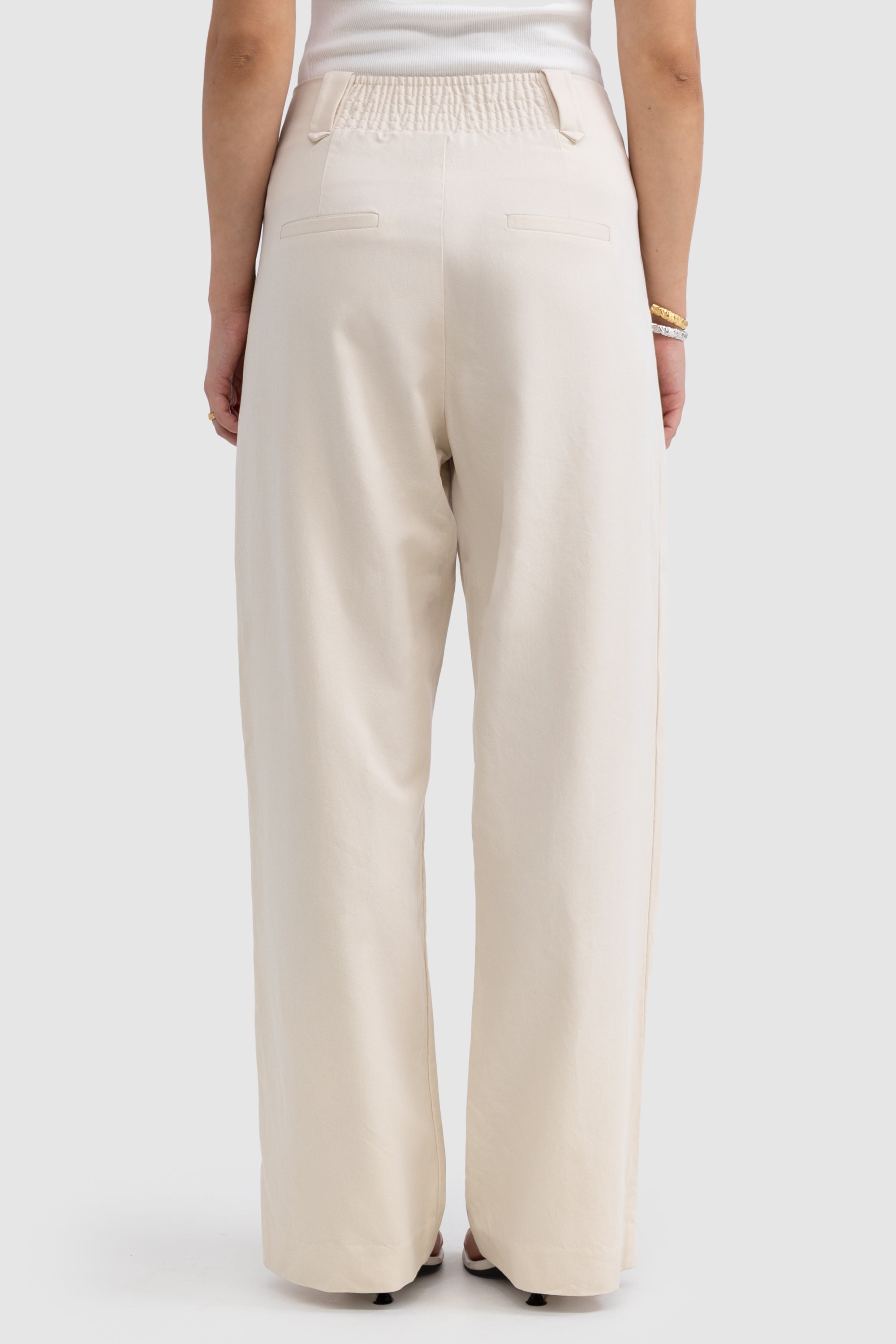 The Aubrey Pant in Ecru is a refined staple that blends structure with effortless style. Cut from a soft suiting-style fabric, it features a high-rise fit with subtle front pleats and a relaxed, wide-leg silhouette. A tailored waistband and belt detail adds definition, while an elasticated back panel offers a effortless style.