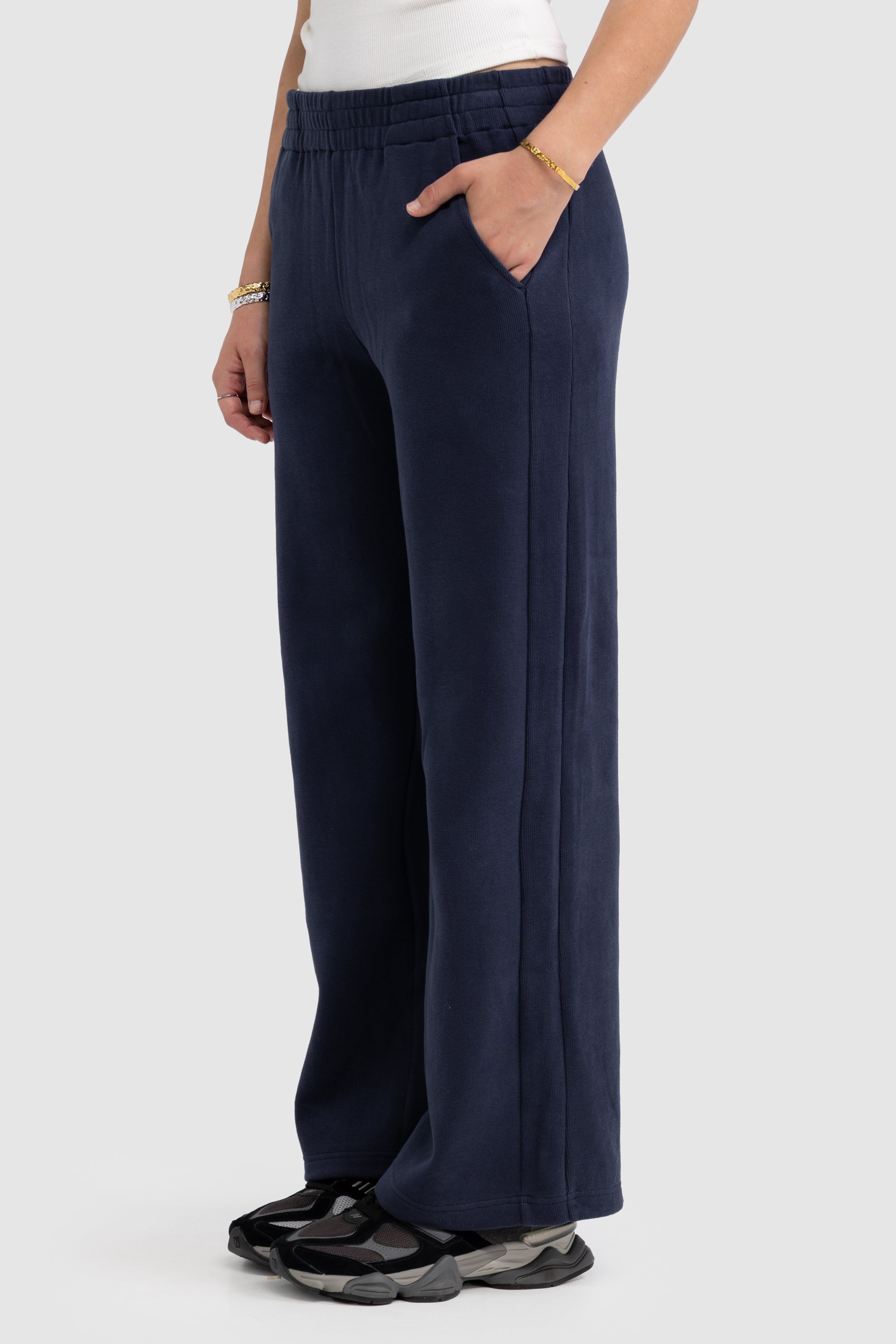 • Elasticated waist with a wider leg profile