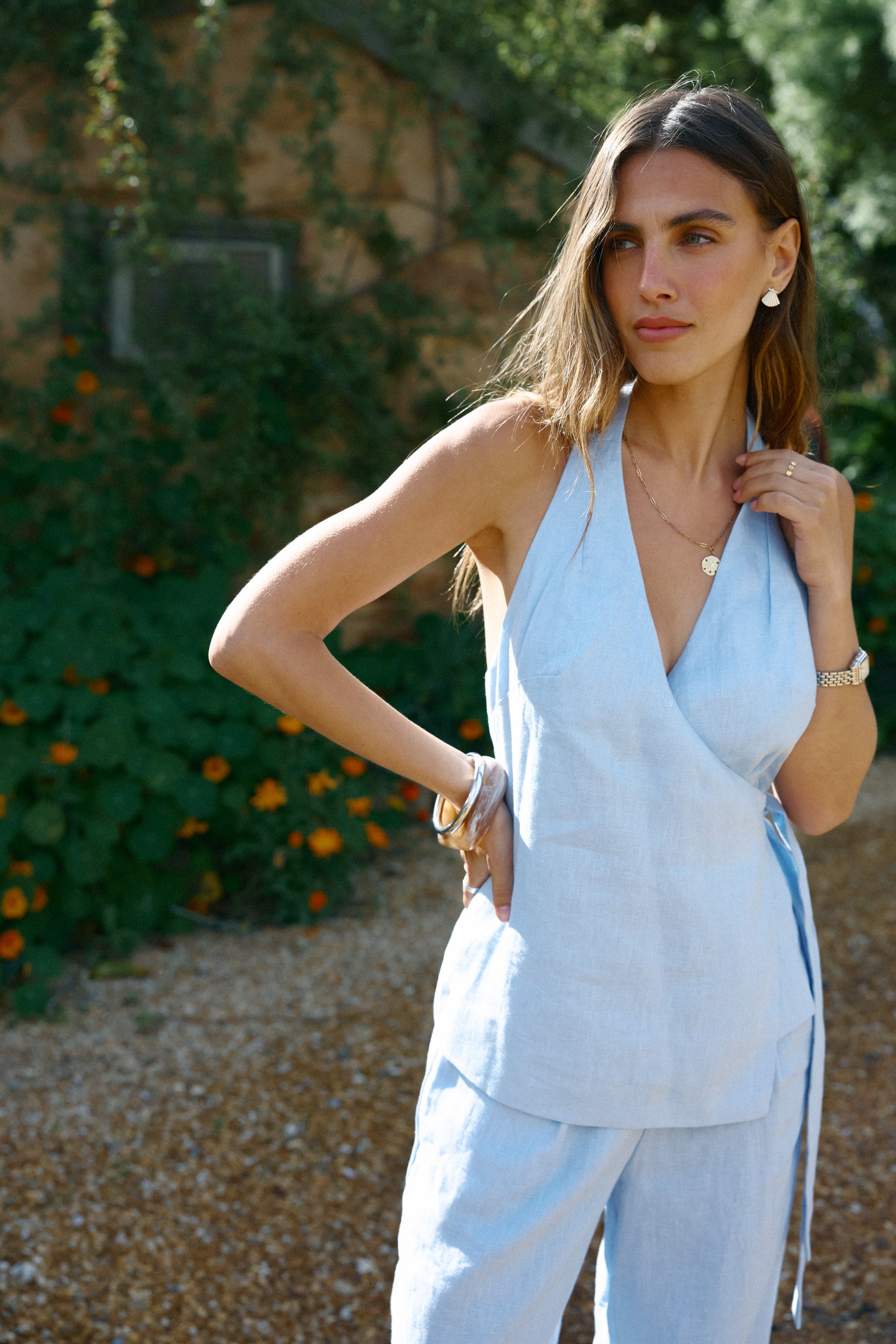 Chic and effortlessly feminine, the Elise Linen Wrap Top is crafted from breathable mid-weight linen. Featuring a halter neckline, plunging front, and open back, it ties at the waist with a matching wrap belt for a flattering fit.
