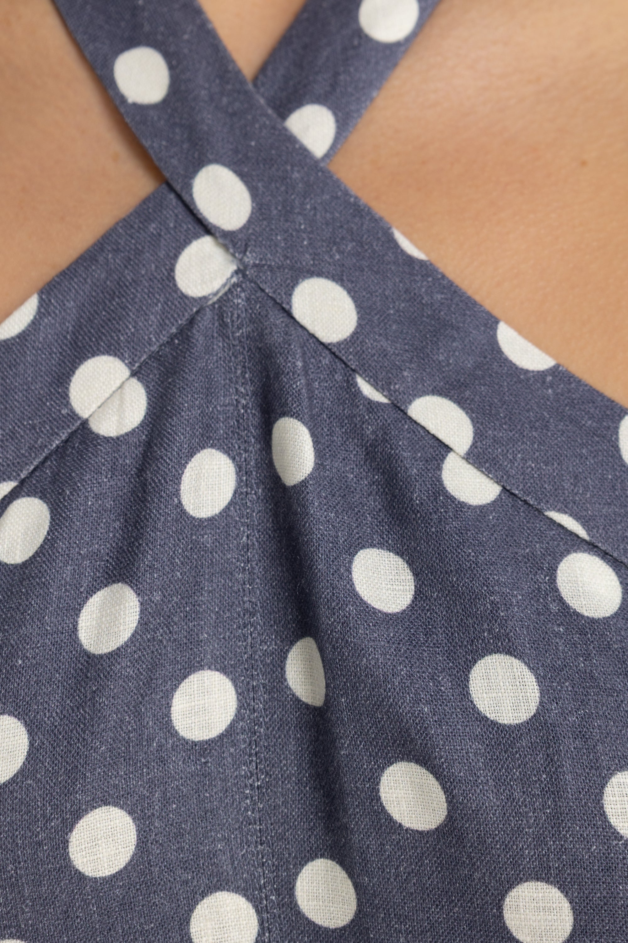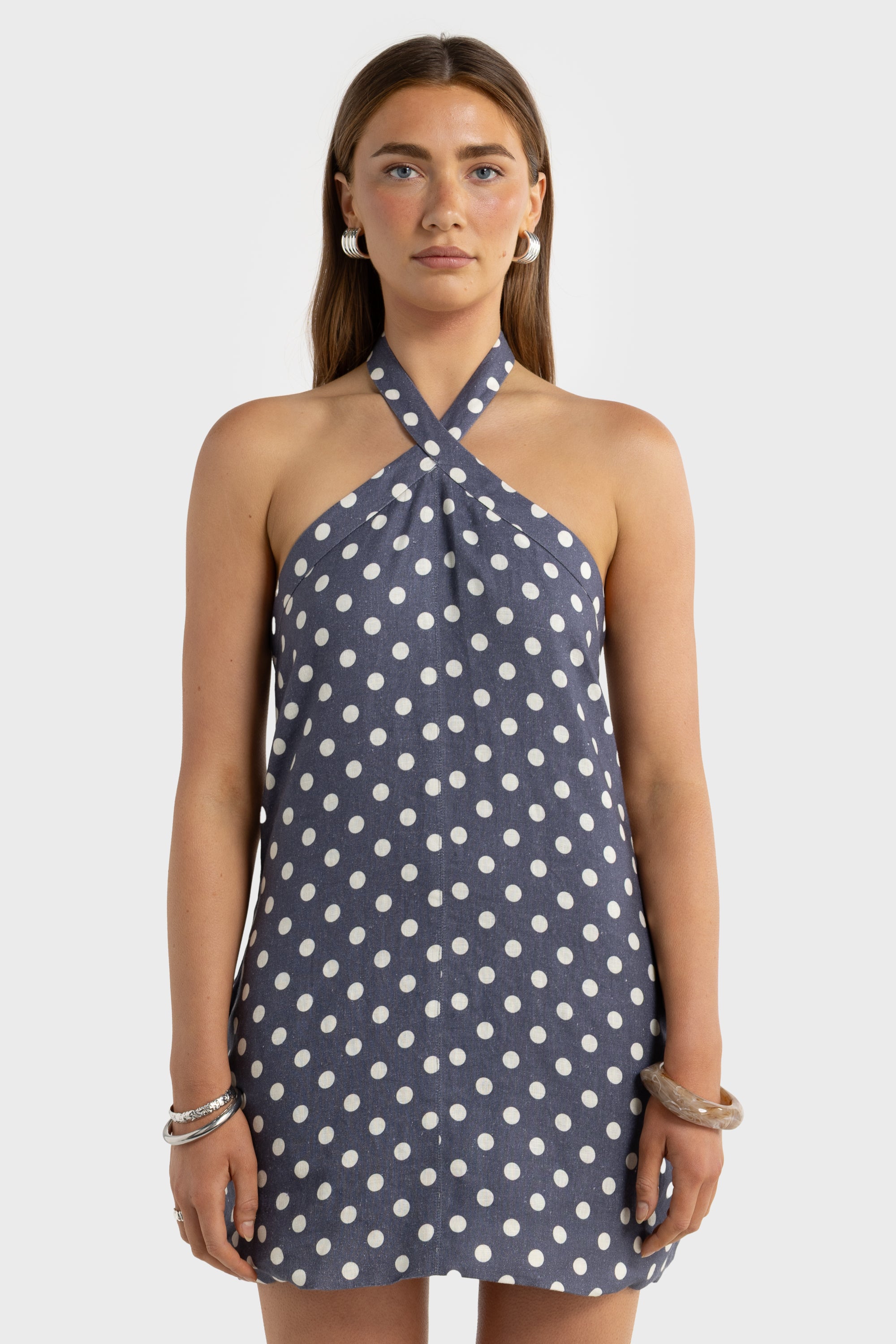 Millie Linen Halter Mini Dress Harbour Blue Polkadot