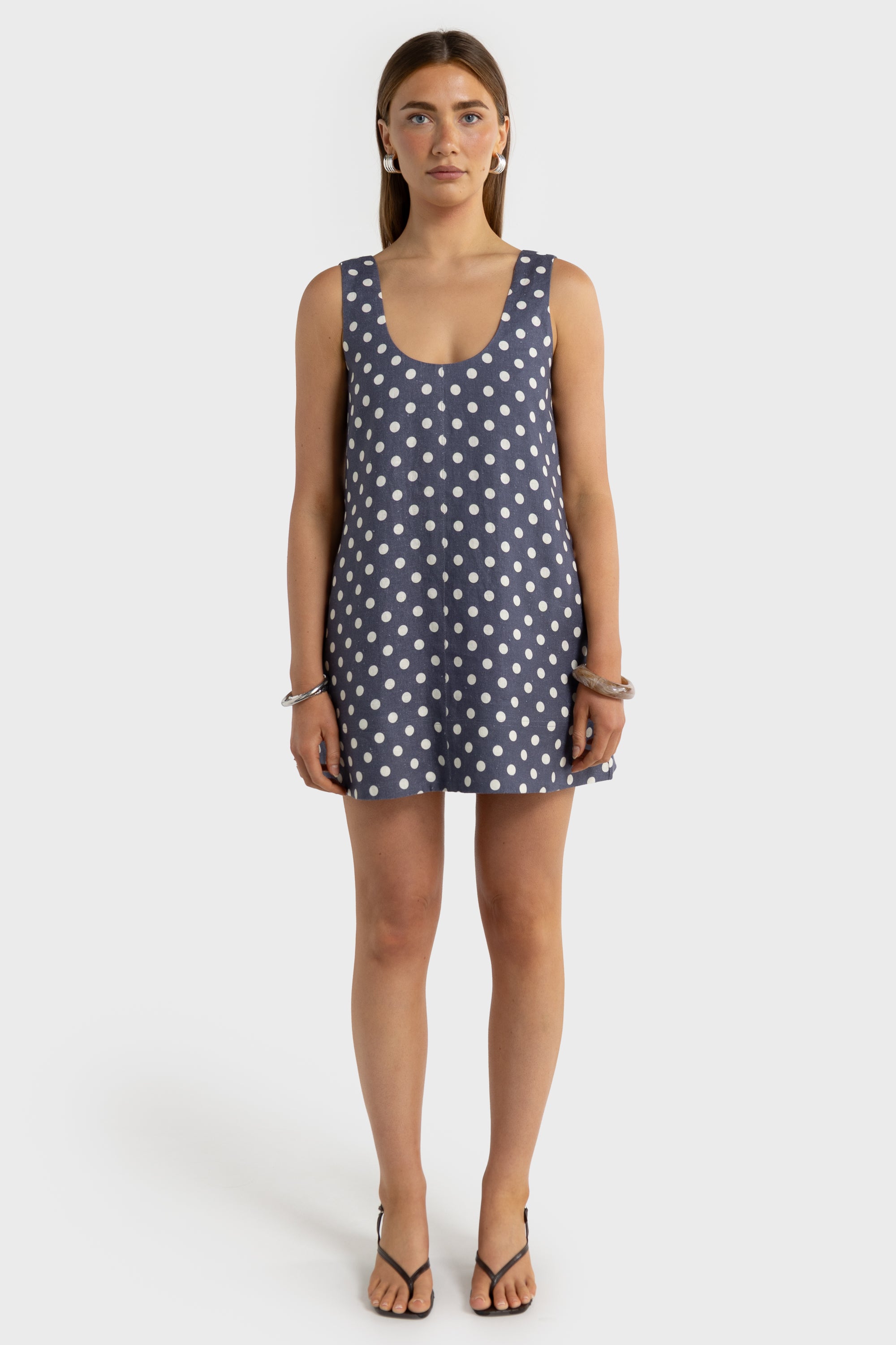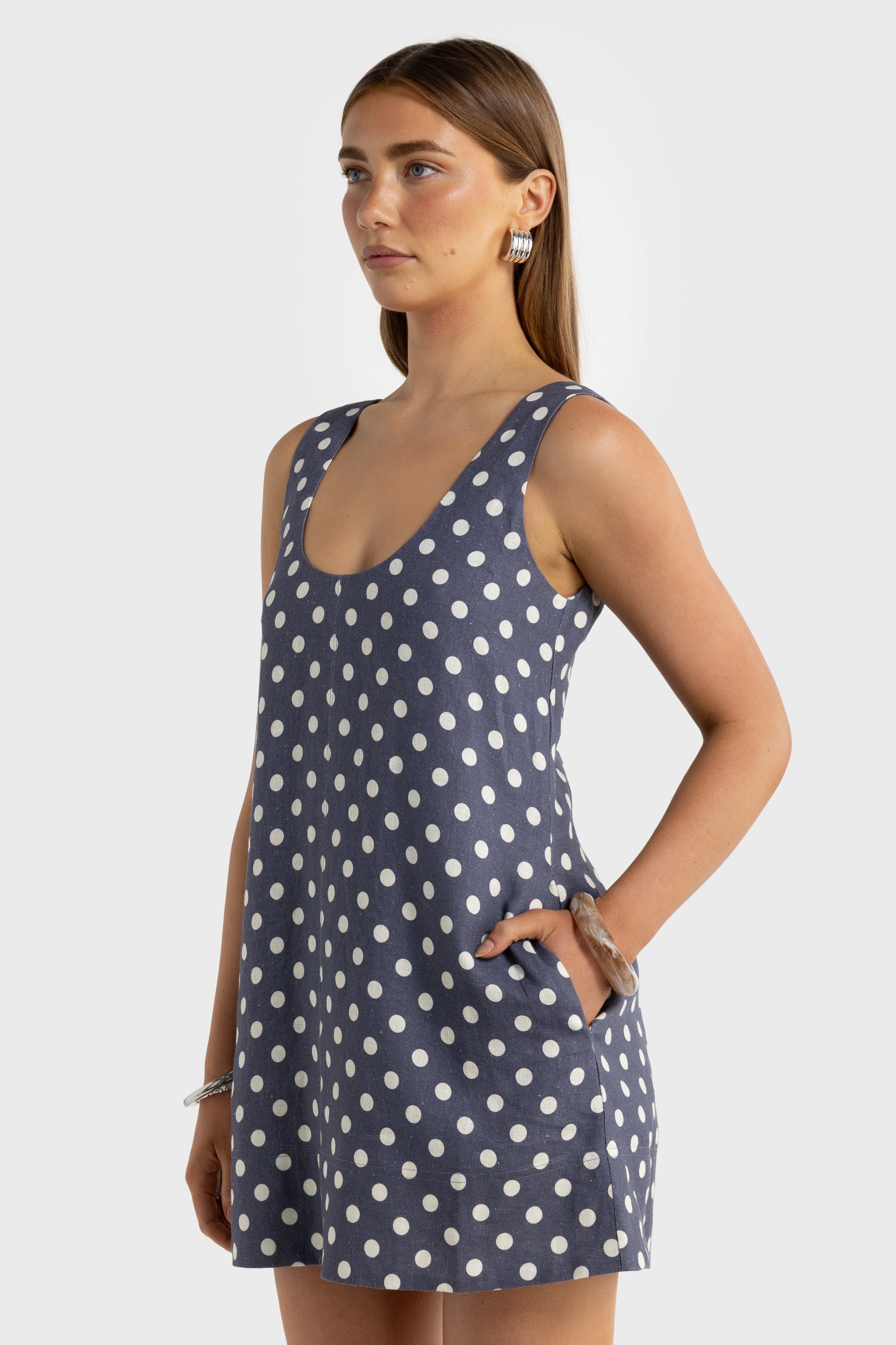 Nora Linen Mini Dress Harbour Blue Polkadot