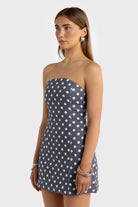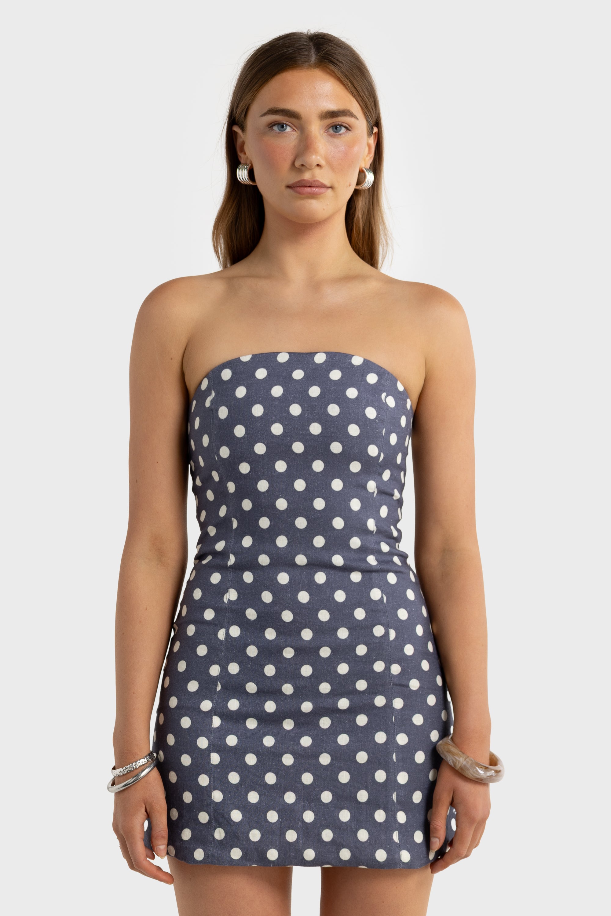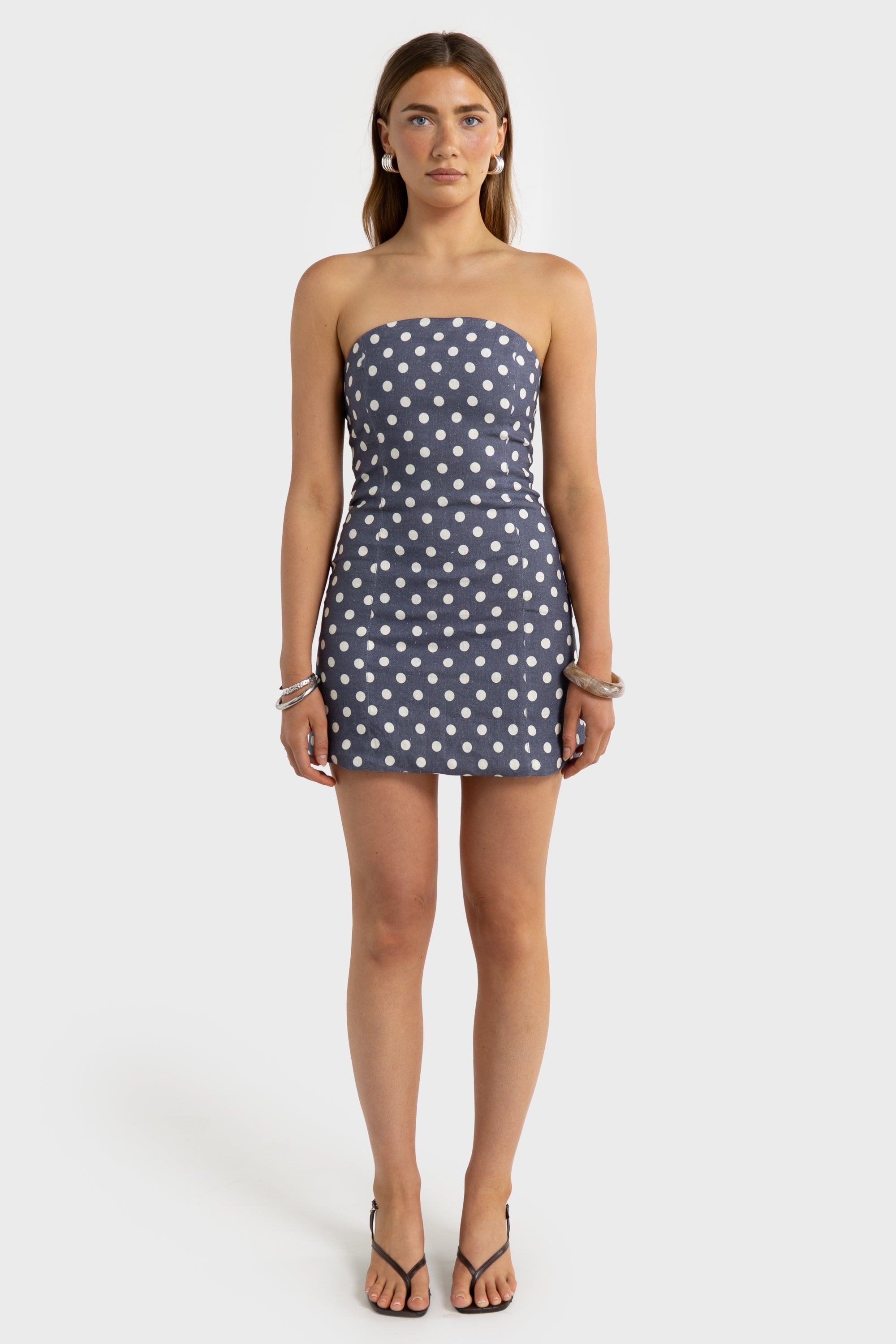 Savannah Linen Strapless Mini Dress Harbour Blue Polkadot