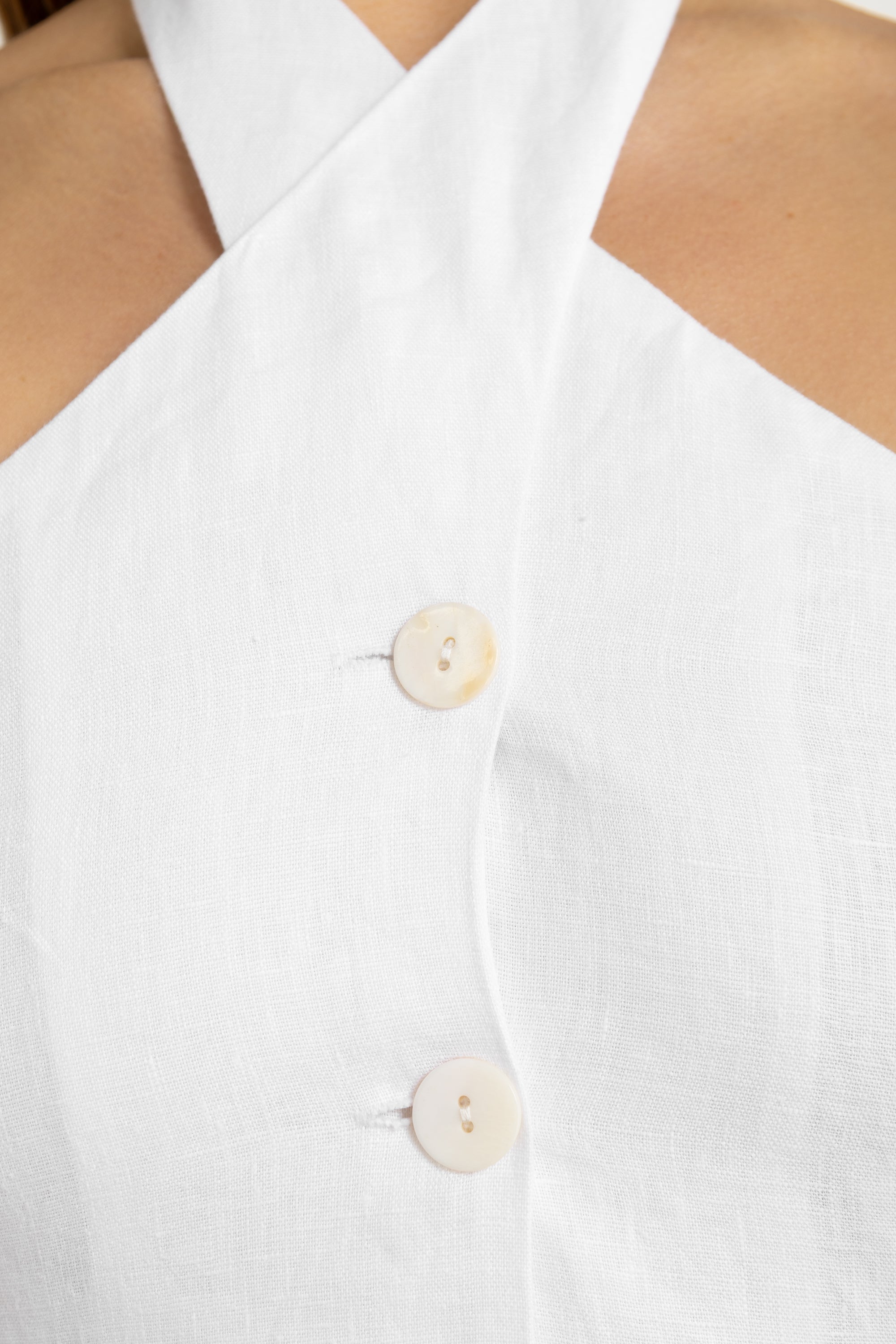 • Halter neckline with button fastening at the neck
