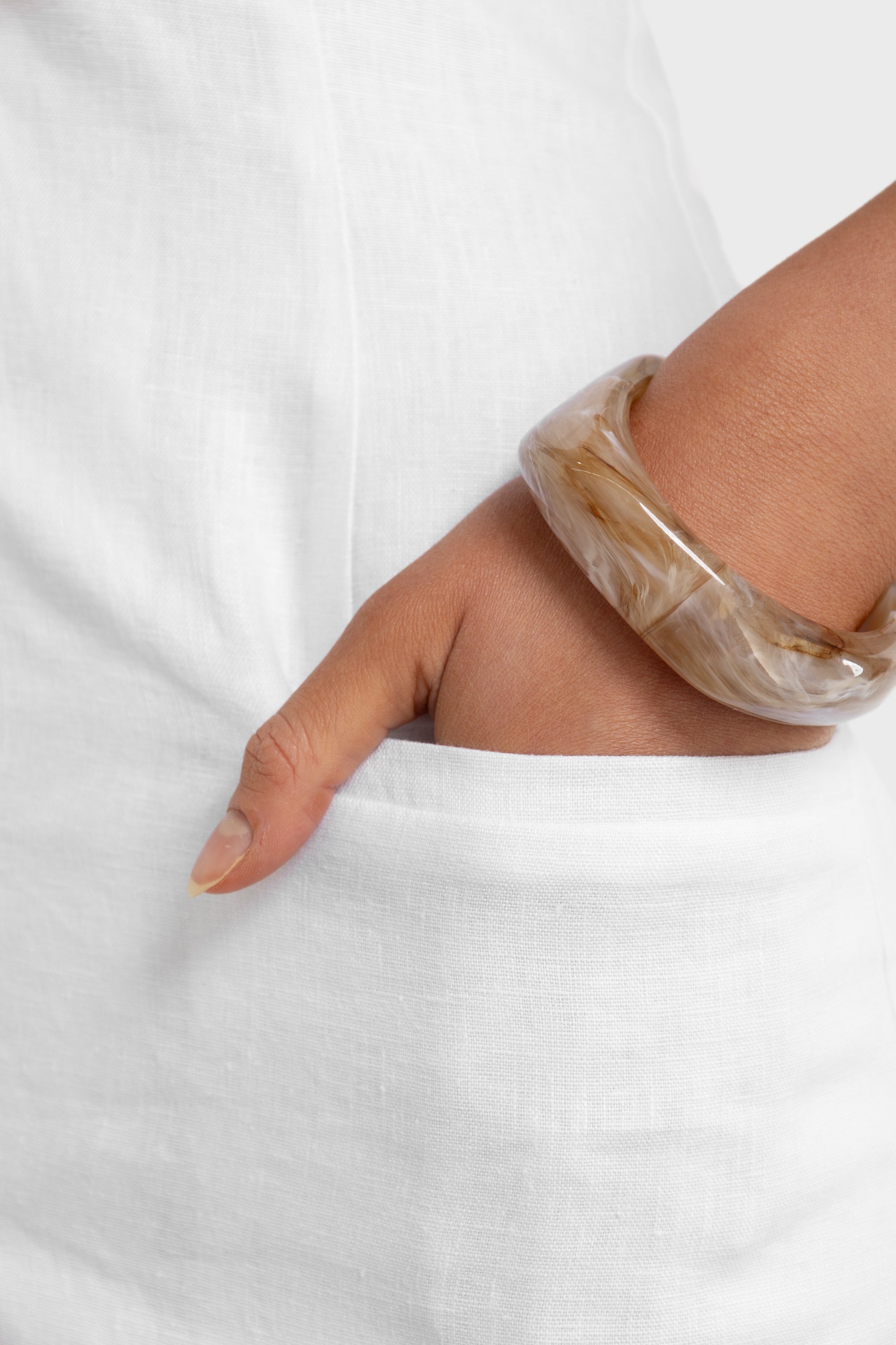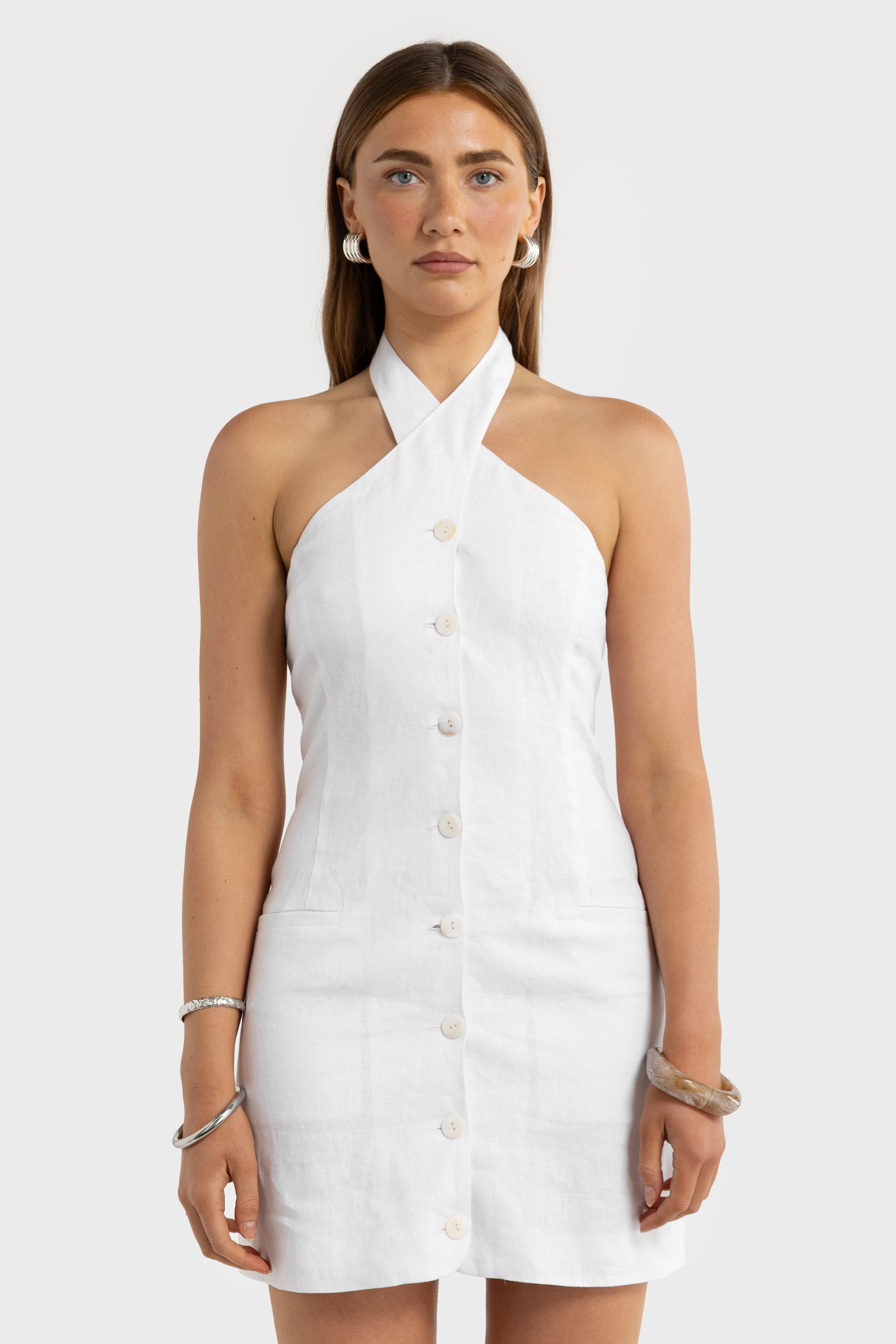 The Xandi Linen Halter Dress is a refined summer silhouette designed for effortless day-to-night dressing. Crafted from breathable linen, it features a flattering halter neckline with a button closure at the neck and a clean, fitted bodice that skims the body. A full button-through front adds a considered detail, while the open back and subtle back split provide ease of movement and a feminine finish.