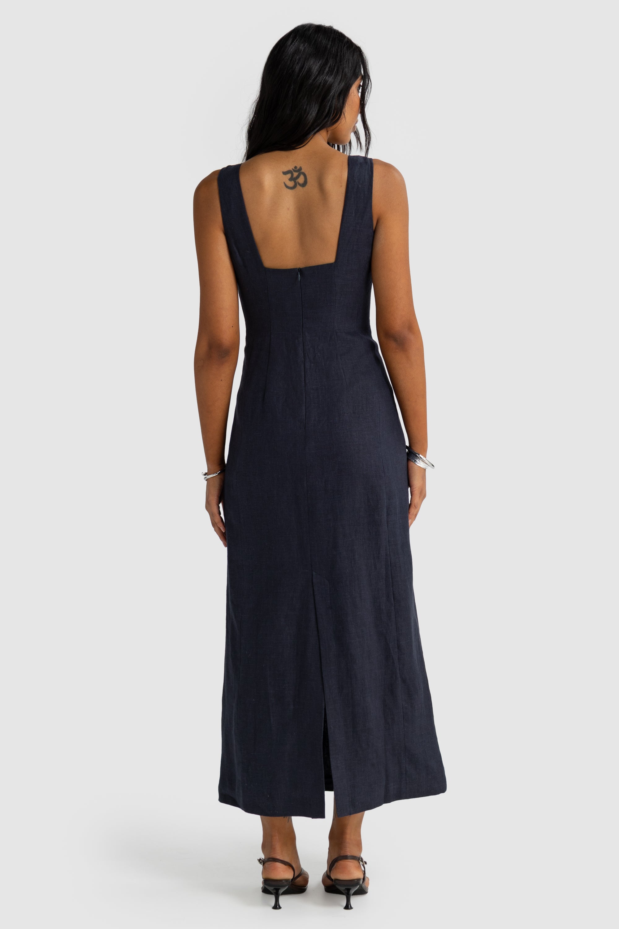 The Zoey Linen Full Length Dress is an effortlessly elegant wardrobe staple designed for timeless wear. It features a structured silhouette with a square neckline, thick straps, and a flattering fitted bodice that flows into a full-length skirt. The back showcases a low square cut with an invisible zip closure and a back vent for ease of movement.